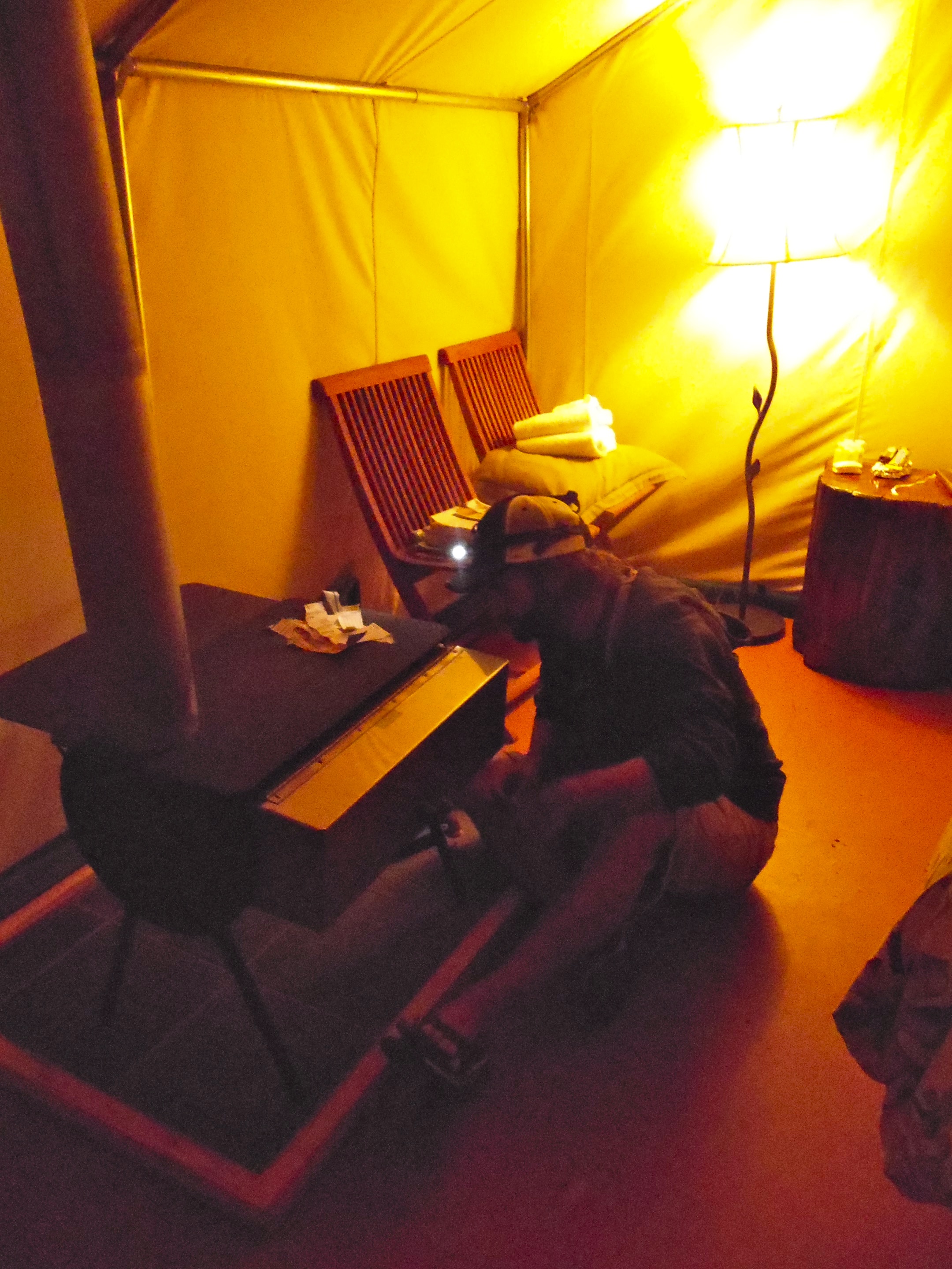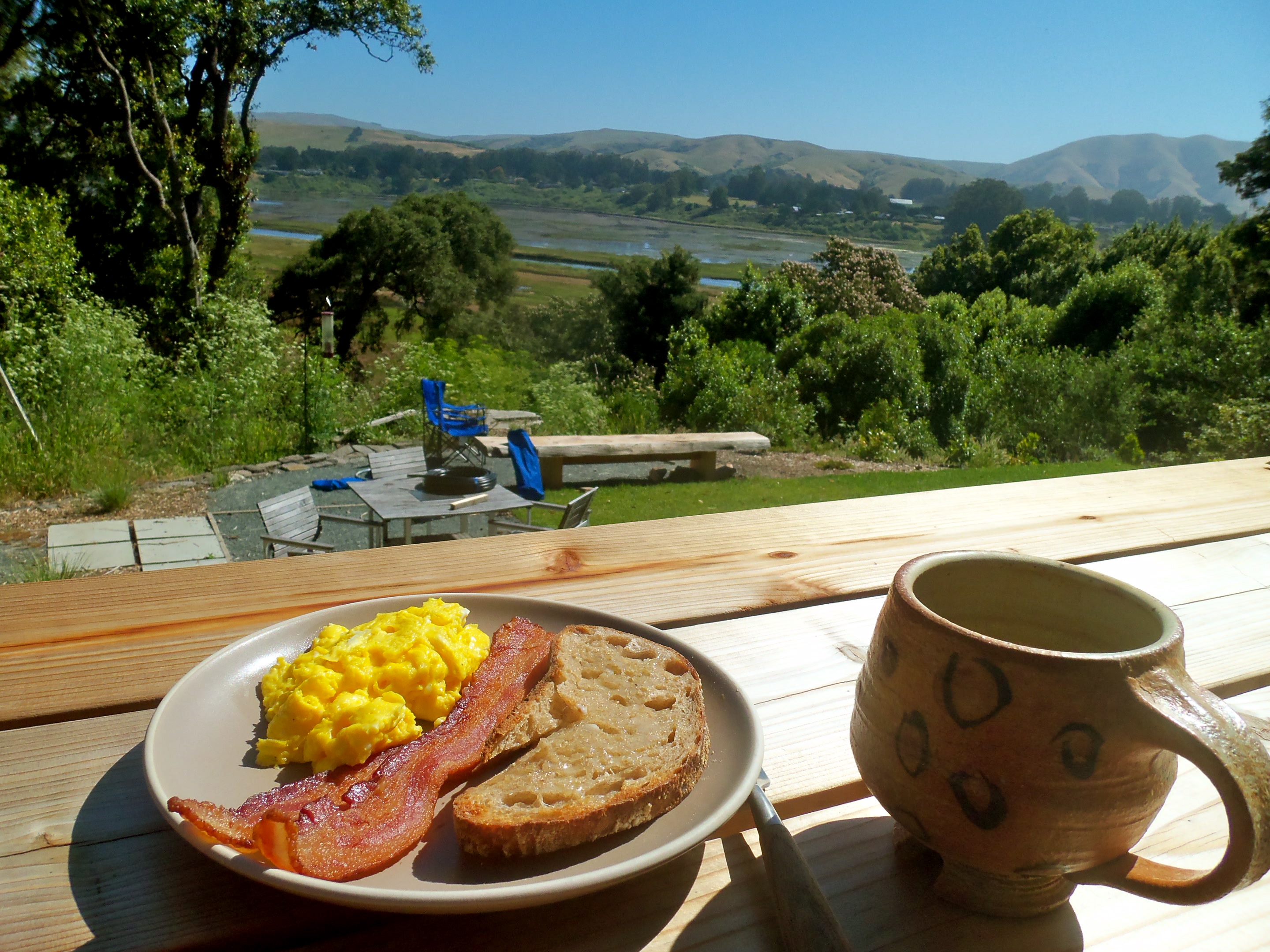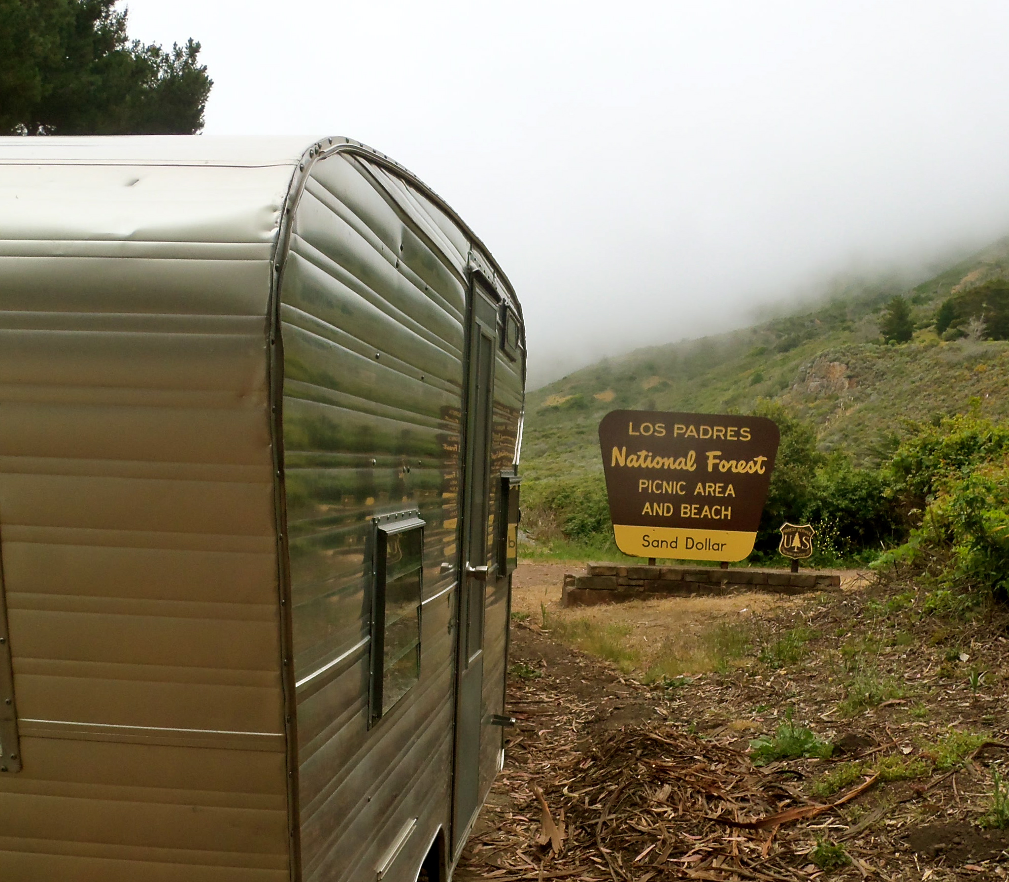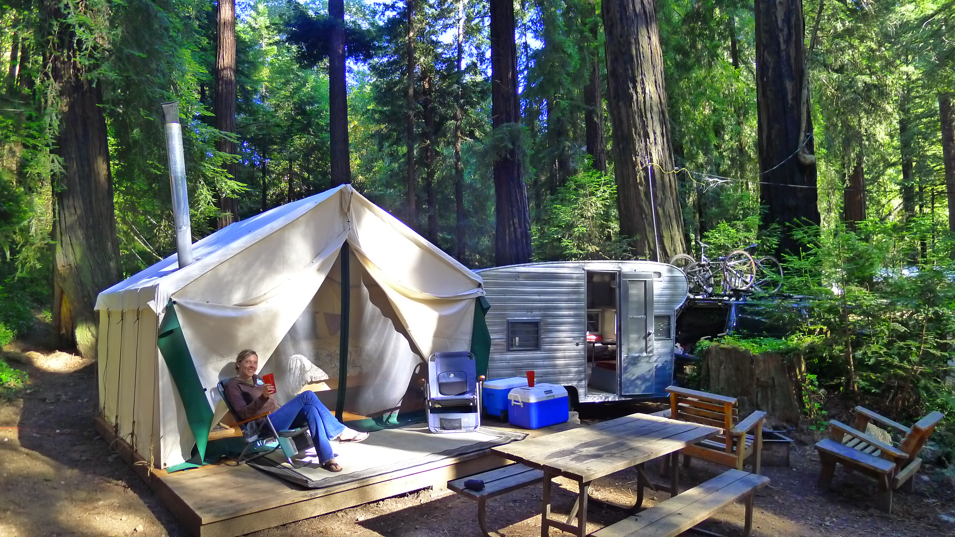 We thought our luck had run out, but then we found the Adventure Tent at Fernwood Campground- our first “glamping” experience. We pulled Betty right up to the canvas tent, poured our cocktails, and clinked a plastic glass to the redwoods above us. Before dinner, we went for a stroll, pausing to hug a majestic tree or two. We were thankful for the extra blankets in the tent because John couldn’t keep the wood stove burning! Fernwood even had hot showers. Heaven! (Read more about the Adventure Tent here.)