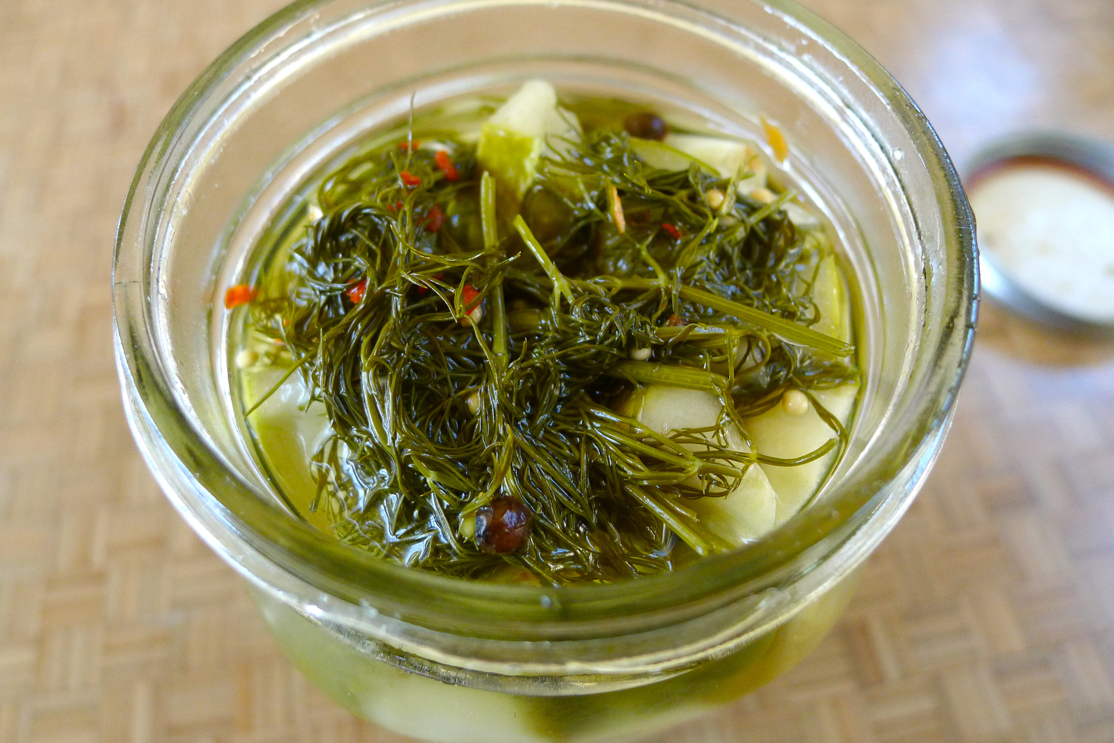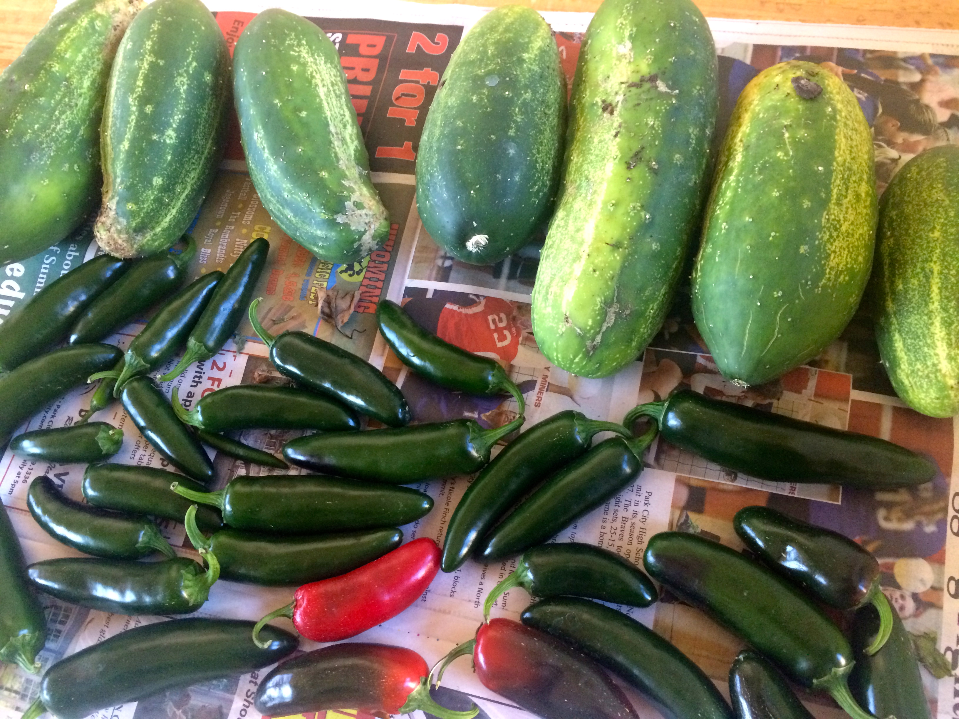 When we returned from our trip two weeks later, we tasted our pickle experiment. The soak in the brine had made those cucumbers tart and delicious. Because I didn’t do a traditional jarring method using heat, the pickles retained a satisfying crunch. You can really taste all of the flavors- dill, pepper, garlic- and there’s a nice heat from those jalapenos that comes a few seconds after you take a bite! I love that the cucumbers and jalapeños came from our own backyard.