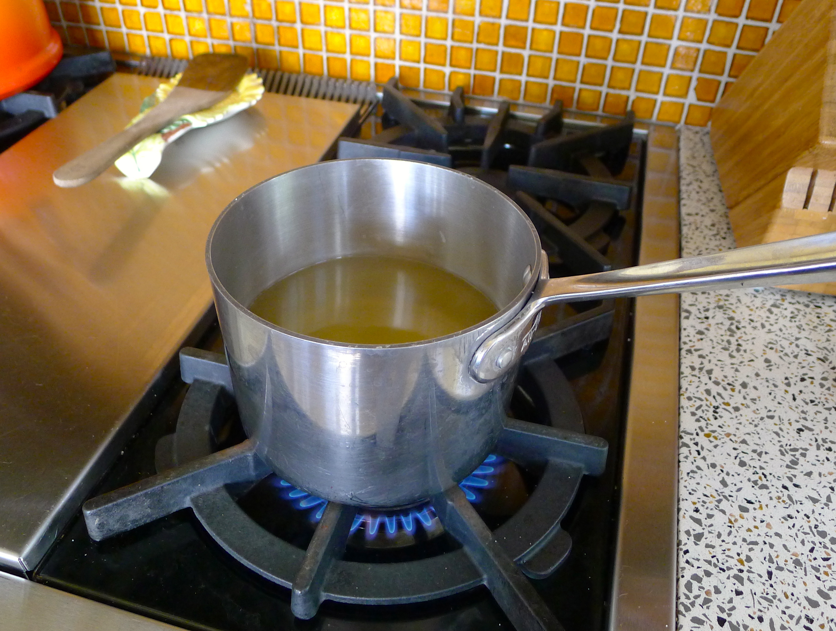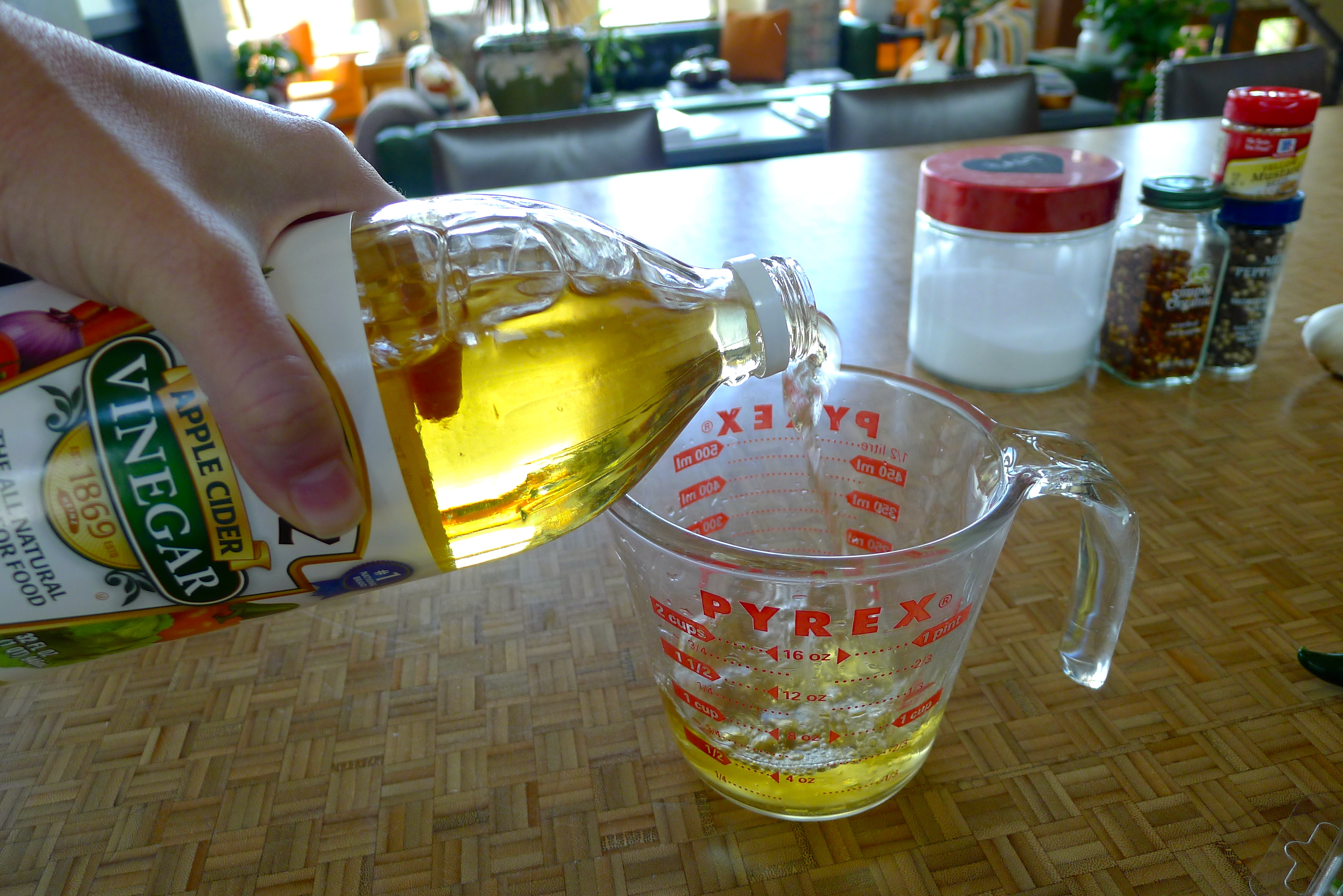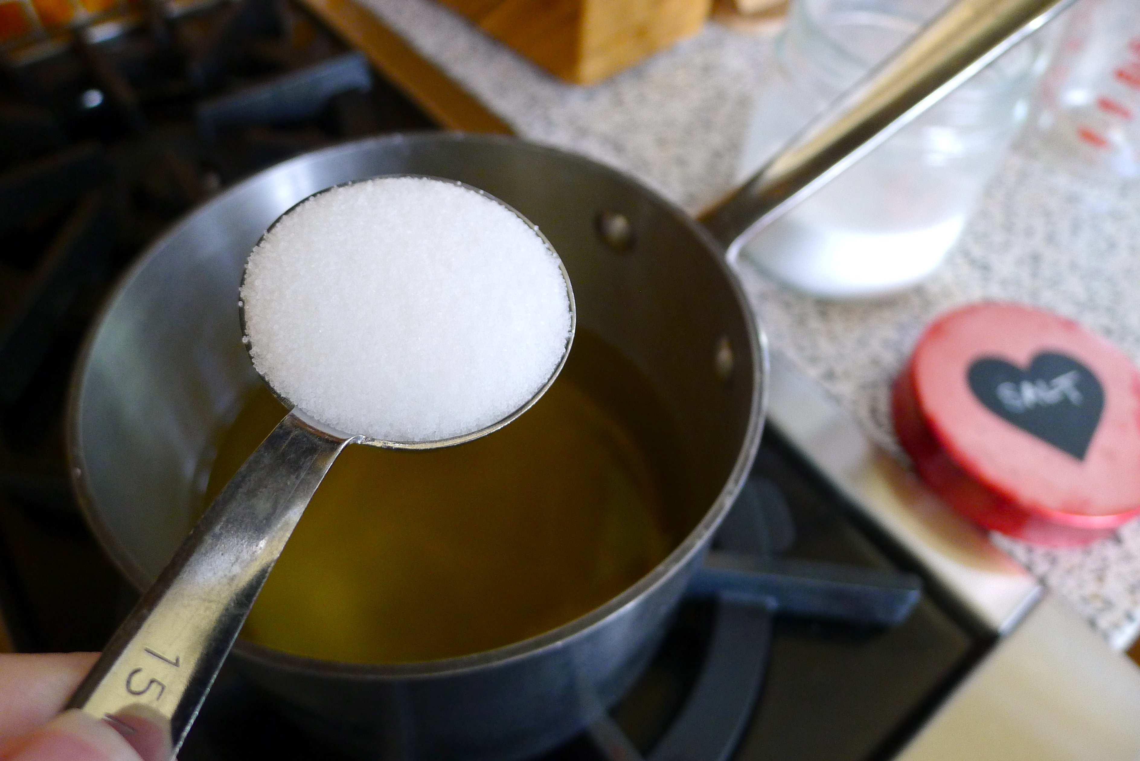 To make the brine, I heated a combination of water and apple cider vinegar on the stove. I dissolved a couple of heaping tablespoons of kosher salt into the liquid.
