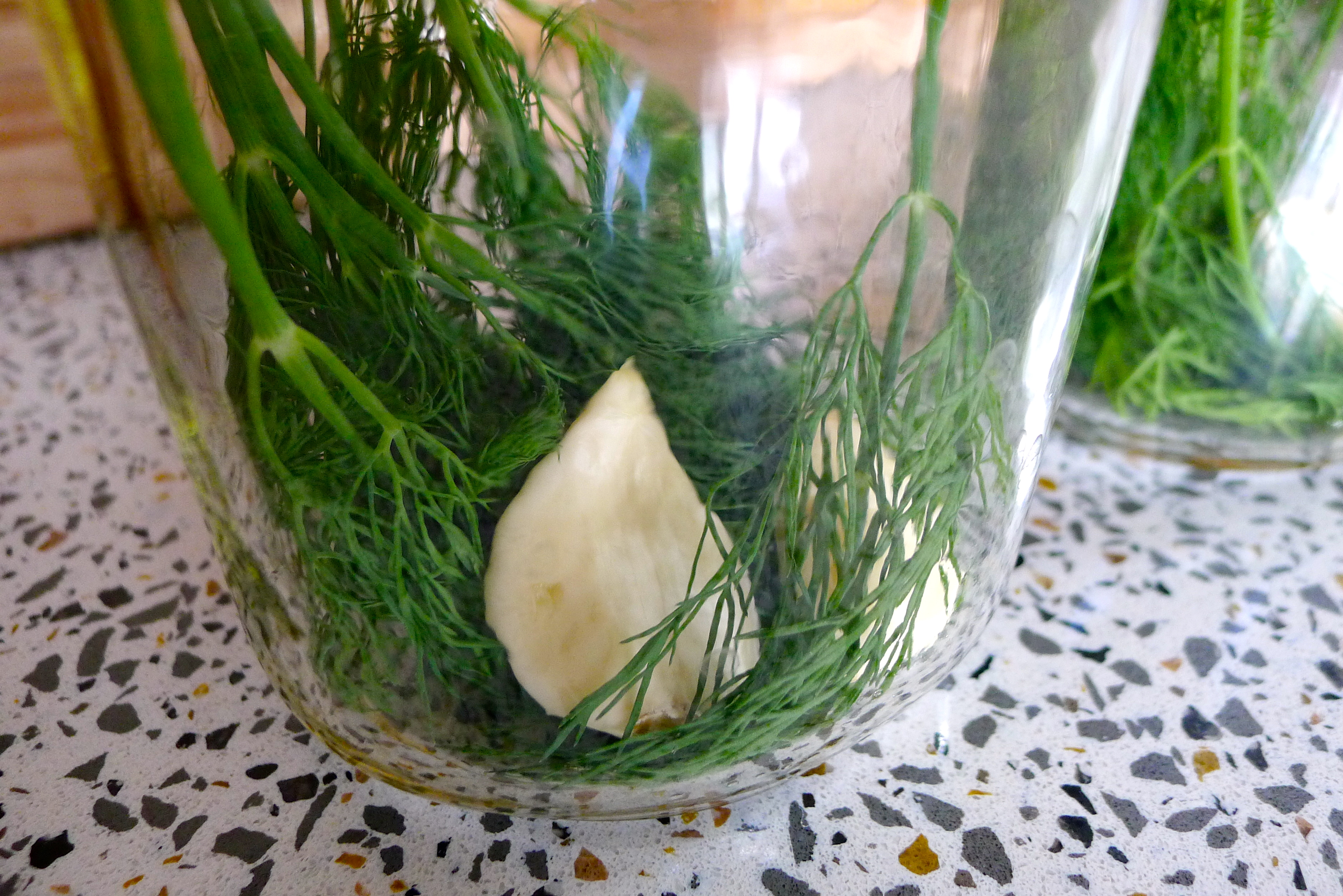 For heat, I added thick jalapeno slices (seeds included!) and another garlic clove on top of the cucumbers. I managed to stuff another dill frond in each jar before pouring the hot brine through a funnel over the whole thing. I made sure the cucumbers were covered with the liquid but left a little bit of space at the top of the jar.
