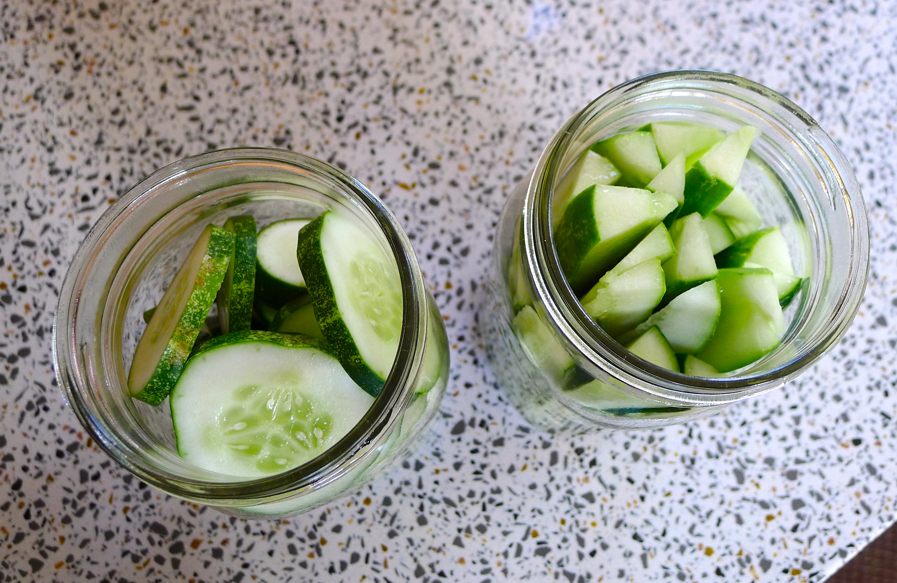 The cucumbers we grew this year happened to be pickling cucumbers. That’s the only itty bitty cucumber plant the nursery had at the time we were ready to plant the garden, and honestly, we don’t really know the difference. They’re short and kind of chubby and apparently they love growing in our garden. I researched a few different pickle recipes and went rogue with my own concoction, a tart and garlicky version with a kick from homegrown jalapenos. After re-washing some pint jars (leftover from last year’s NOG), I started by cutting up the cukes, some into spears and some into slices.