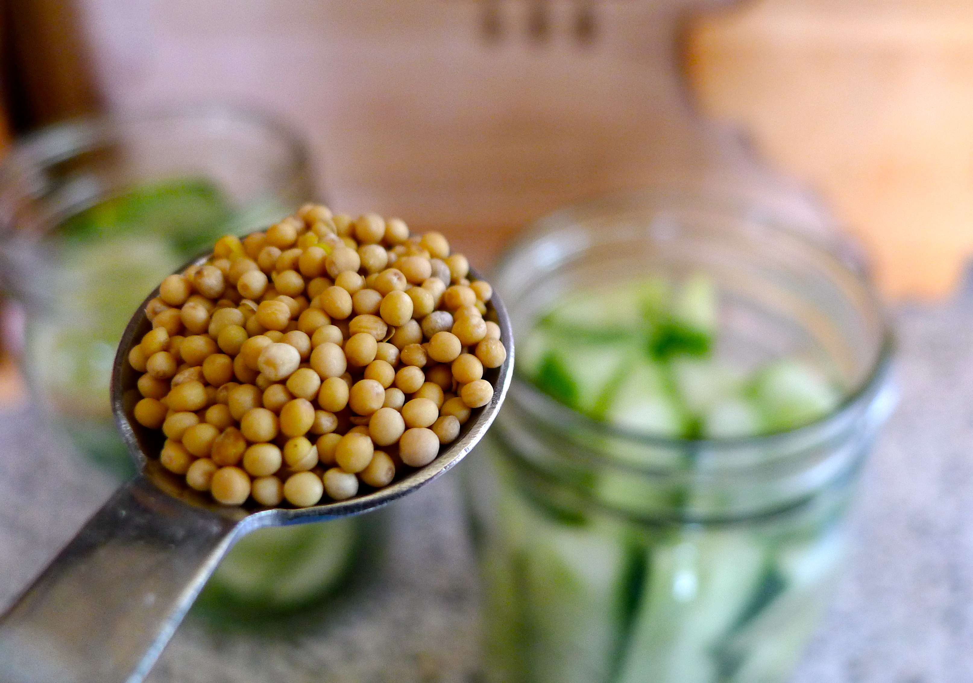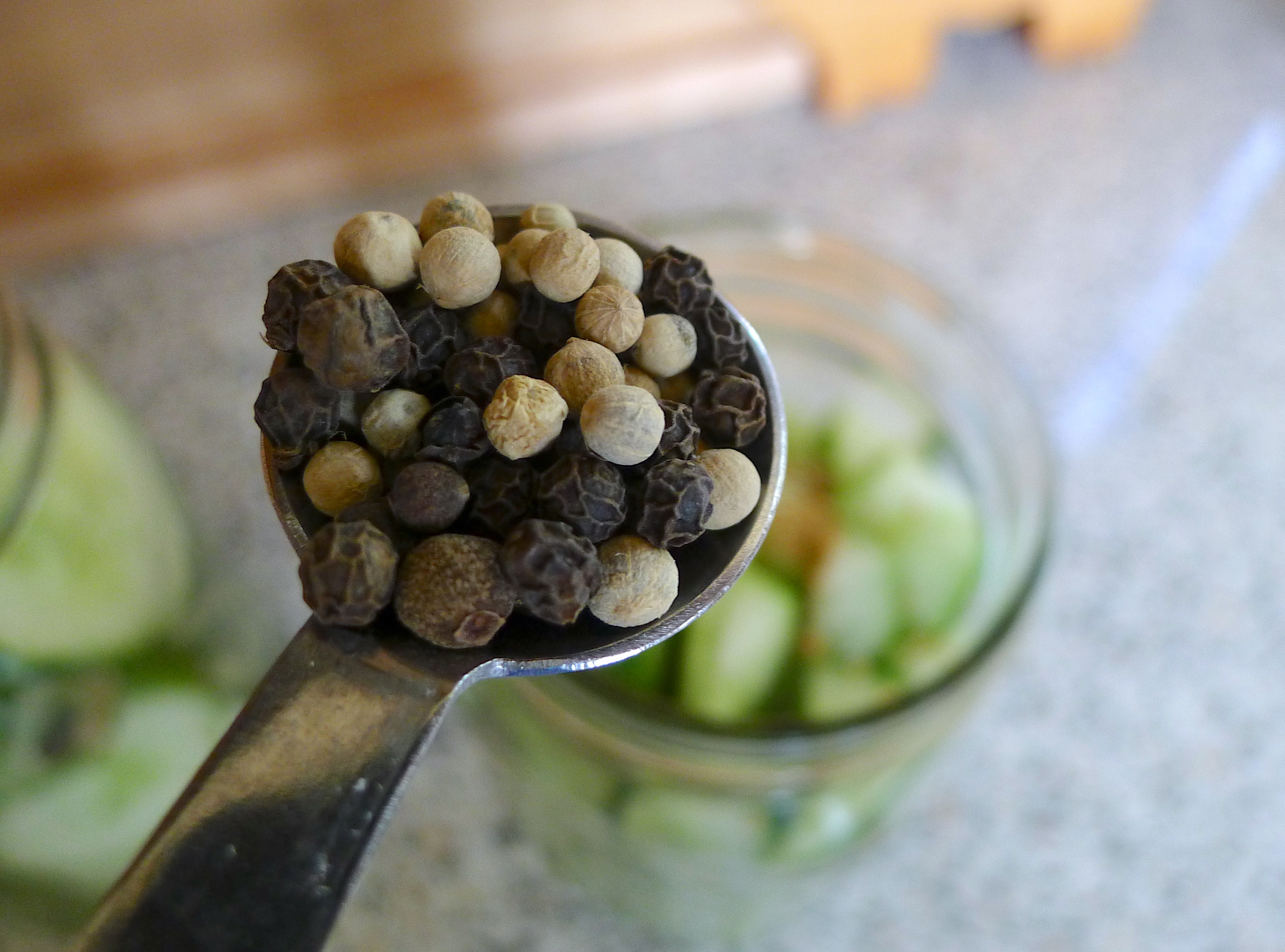 Into the sterilized jars, I shoved a lot of fresh dill fronds and dropped a couple of whole smashed garlic cloves in them, too. I filled the jars with the cucumbers, then added more flavorings with mustard seed, crushed red pepper, and whole peppercorns.