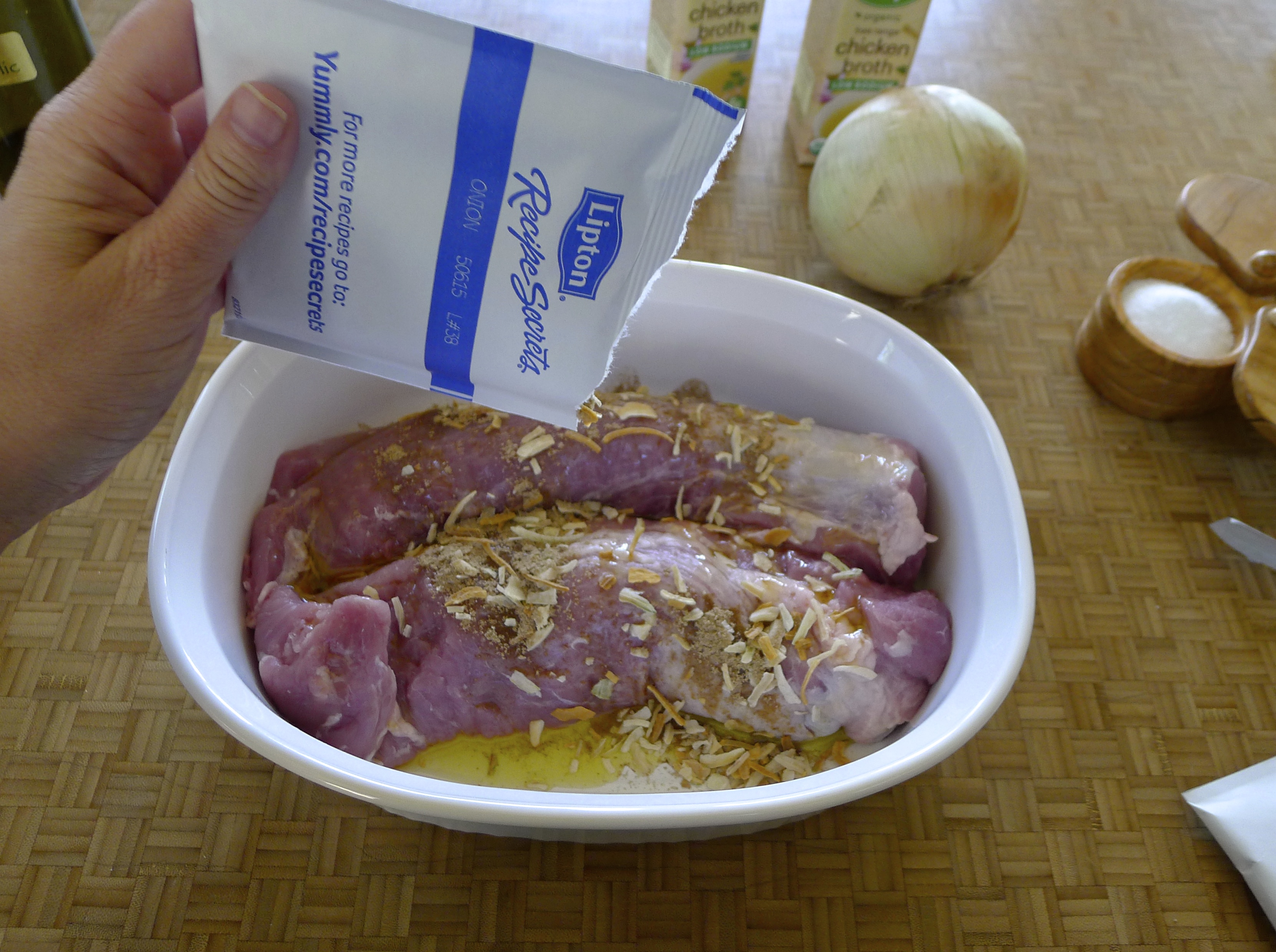 Place pork loin in a baking dish. Drizzle with olive oil and season well with salt and pepper. Sprinkle with the soup mix (it’s ok if a lot goes into the dish). Place the onion chunks around the pork. Pour about an inch of chicken broth into the dish. Cover tightly with foil and bake for 30 minutes.