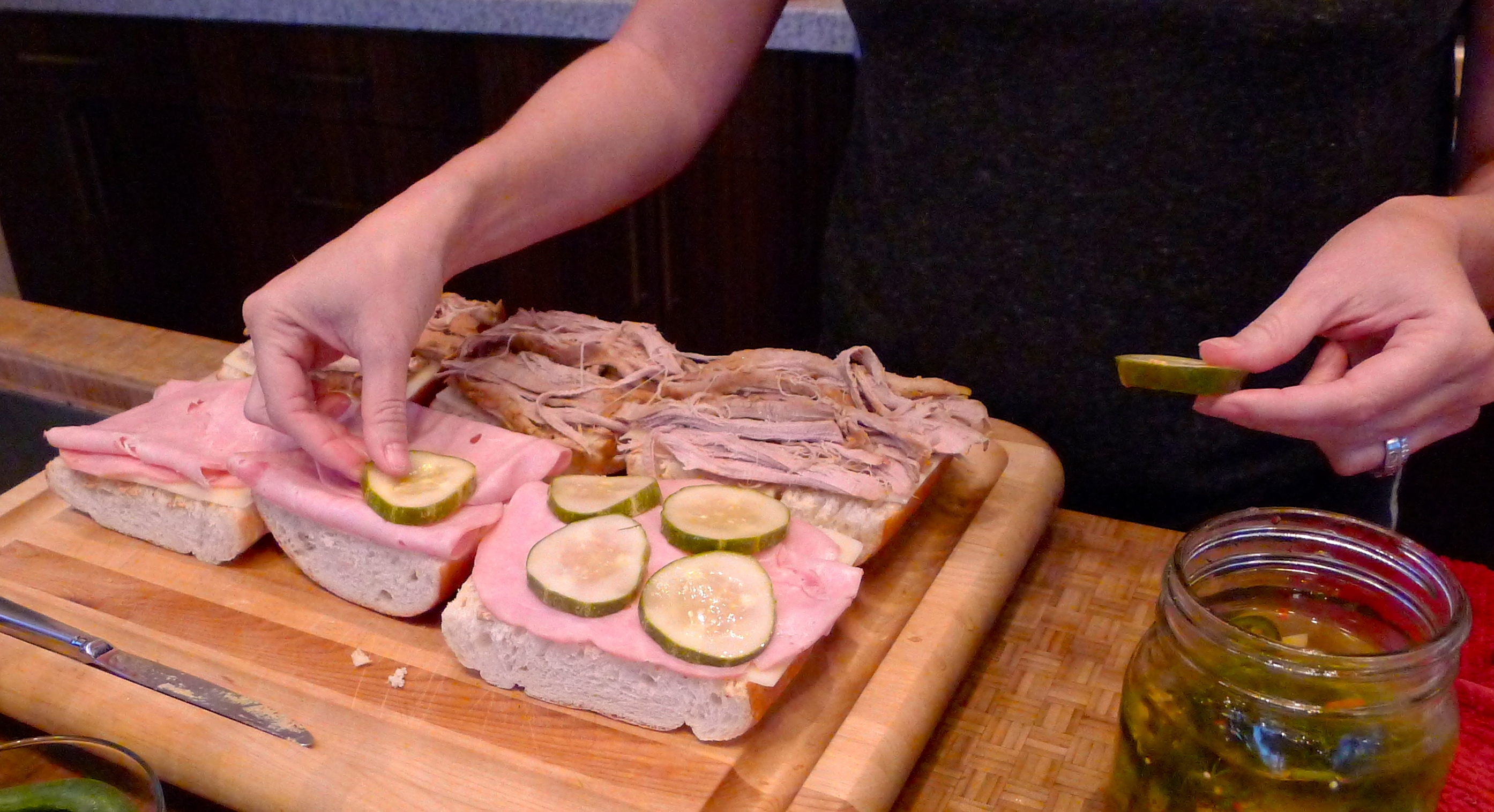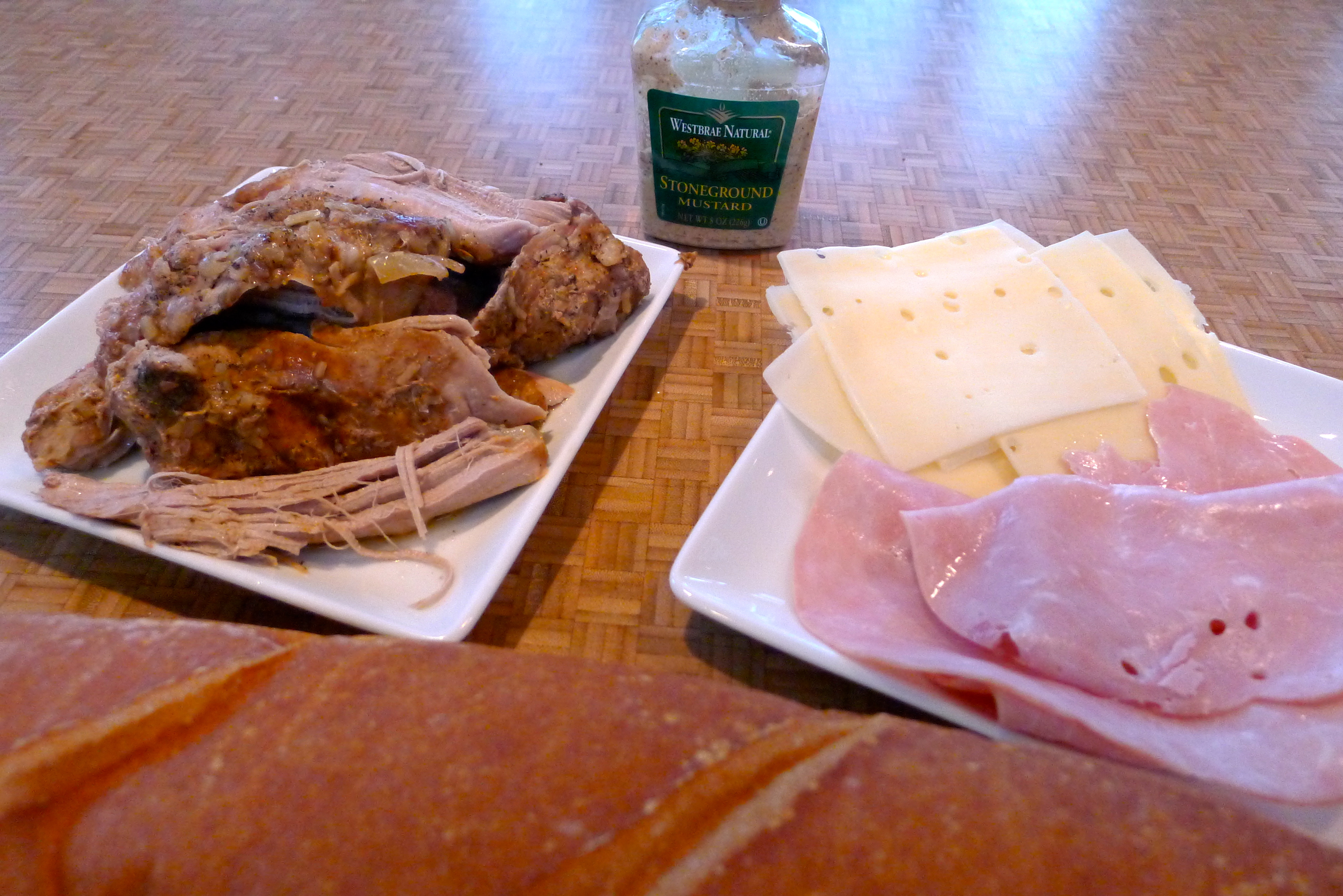 The recipe made quite a bit of pork roast. I took some of it out for the Cubans and saved the rest in the braising juices for other fabulous meals. Deli ham, sliced Swiss cheese, stoneground mustard, and a loaf of crusty French bread… let’s make some Cubans!