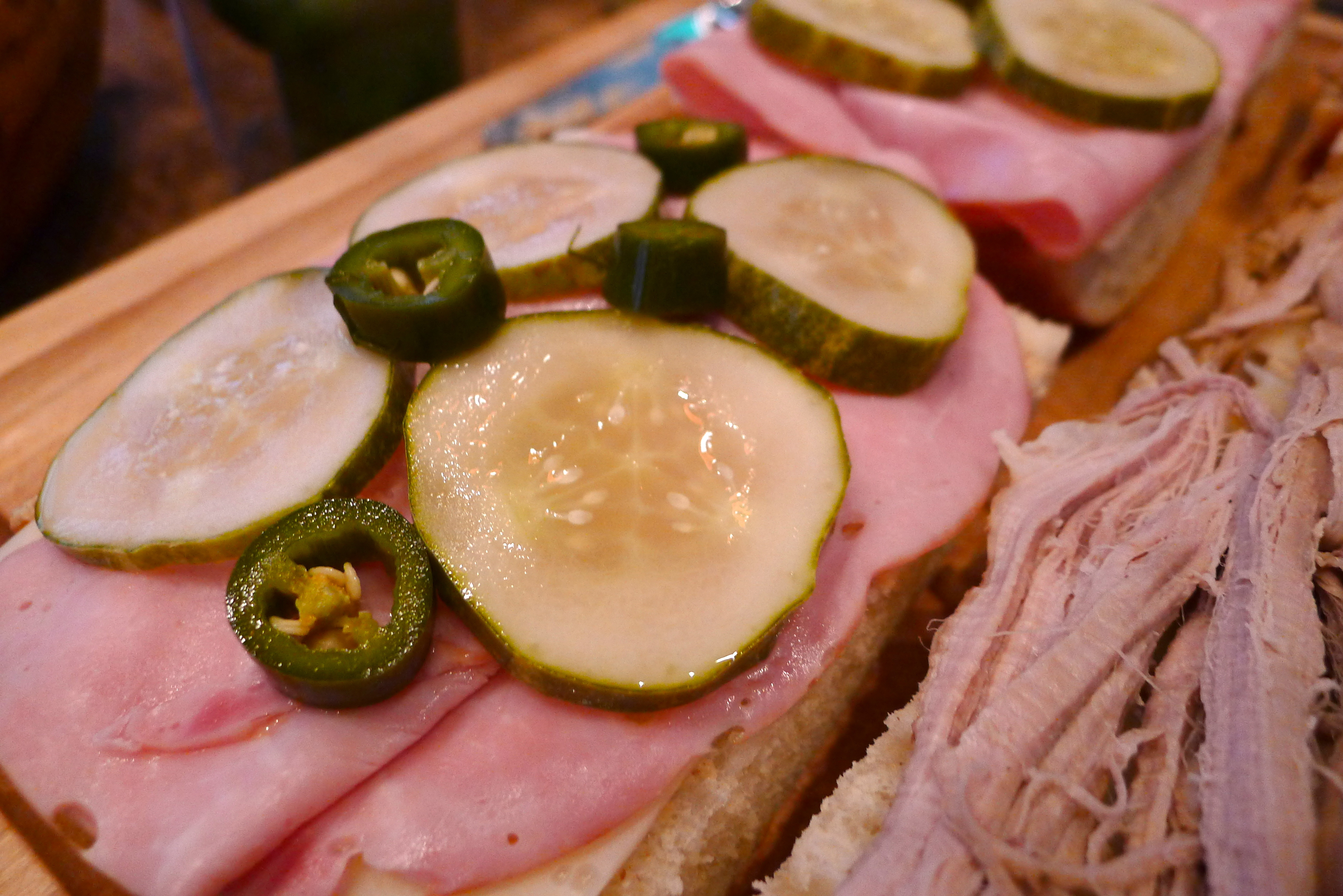 I started by spreading plenty of mustard on all slices of bread. Next, I layered cheese on both sides. Then came the pork party: shredded pork roast on one half and ham slices on the other. Finally, the item that triggered the whole Cuban sandwich experiment- pickles! I added a few of the jalapenos from the pickle jar, too. We like it hot!