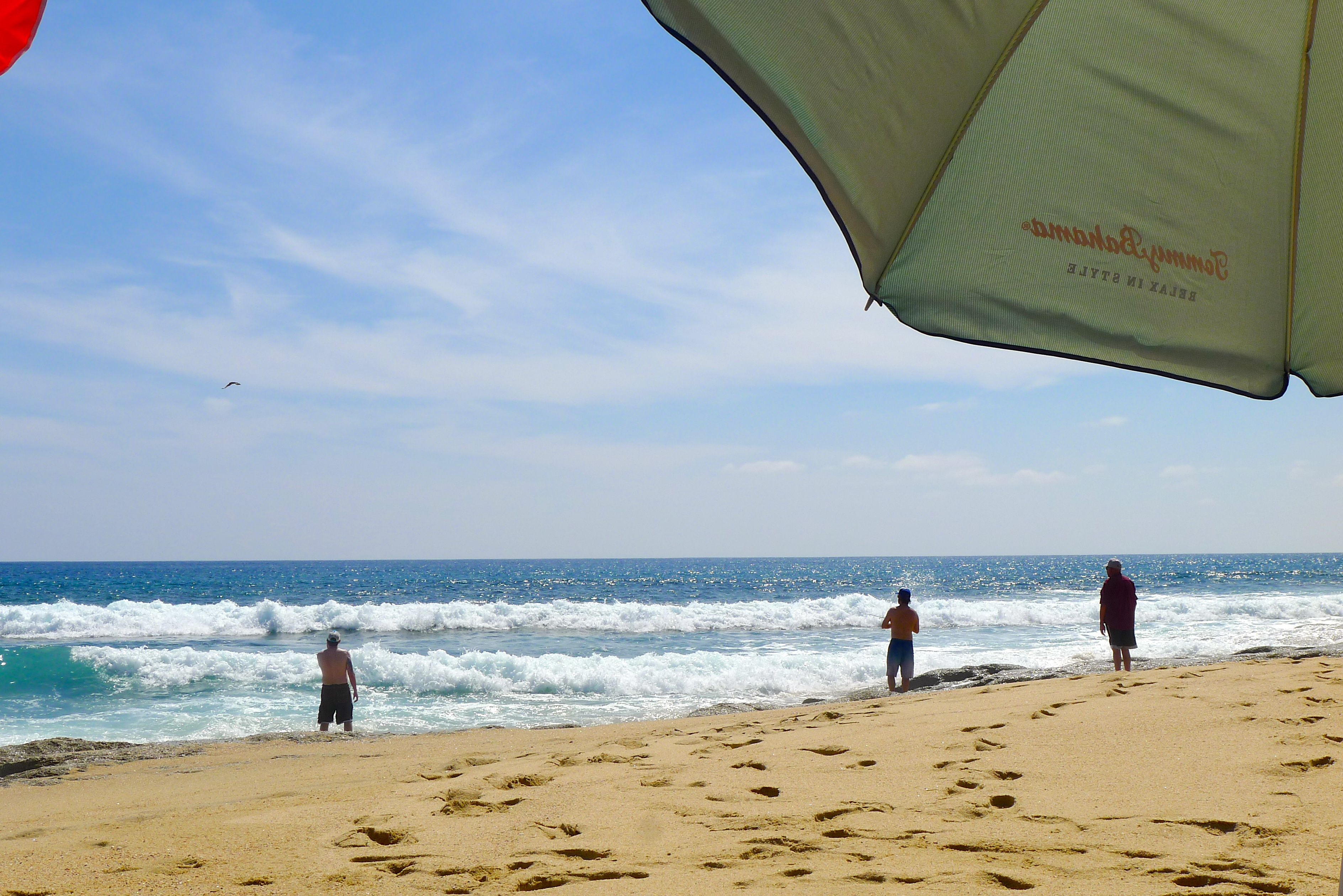 After an hour or so, I took a walk down the beach toward John and he came back with me to our little shade island to tell the day’s fish tales. He’d had a yellowfin tuna on the line and brought him to the reel before the fish outsmarted him and released himself somehow. He’d caught a jack or two. He’d chased the elusive rooster, as well. After a sandwich and a beer, he went off for more fish stalking. It’s hard not to smile when the man you love is doing his very favorite thing; his joy was contagious. When he finally called it a day, we packed up the car and took a dip together in the sea. What a strange feeling to bob around in the waves with a baby bobbing around inside me! The water felt incredible and I was relieved to have finally swum in the ocean on this trip.
