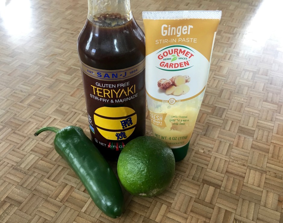 In a large freezer bag, mix the teriyaki sauce, half of the chopped jalapeño, the ginger, and the juice of half of the lime. Add the steak, close the bag, and massage to make sure the meat is coated with the marinade. Place in the freezer to marinate for at least 3 hours.