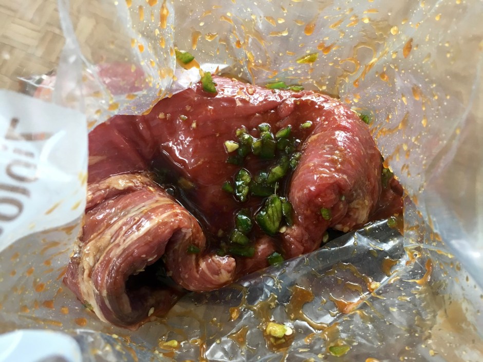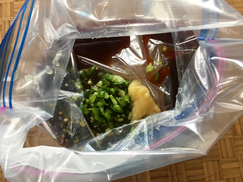 For this dish, it’s all about the meat. I picked up a flank steak and spruced up a teriyaki marinade with jalapeño, lime juice, and fresh ginger. (A plain teriyaki sauce would be delicious with these ingredients, too.) I made the marinade right in a plastic freezer bag and added the steak, gave it a good massage, and let it hang out in the fridge for a few hours. The longer it sits in the marinade, the more flavorful the meat will be!