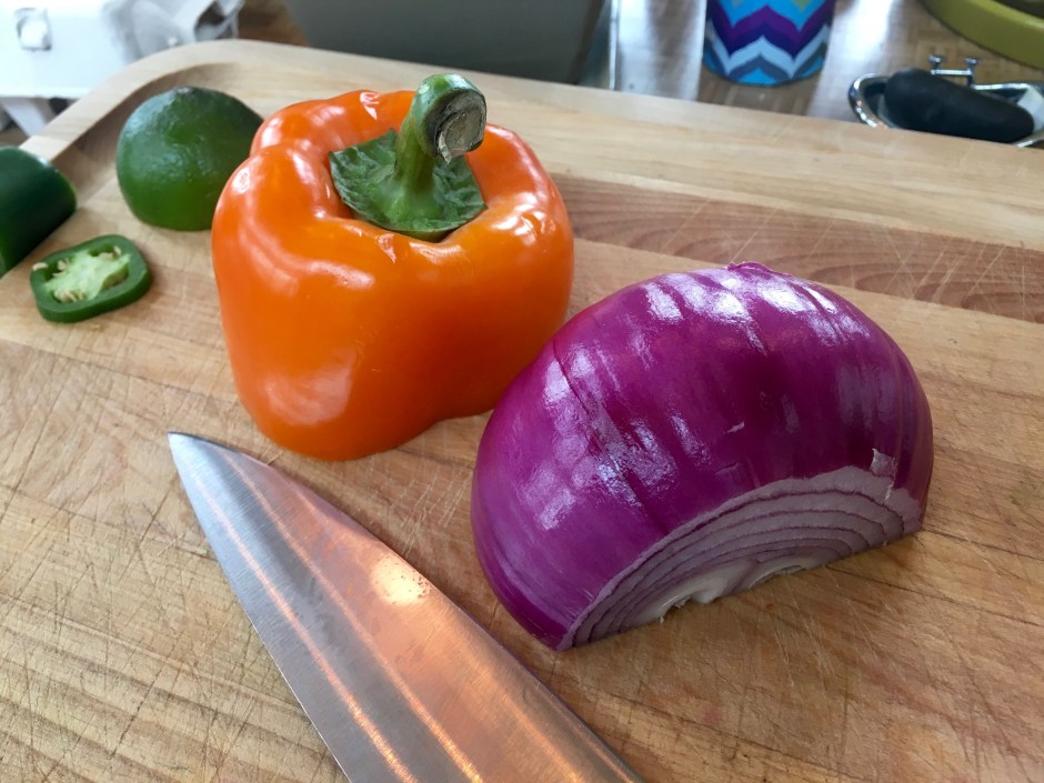 When it got closer to dinner time, I prepped the rest of the filling ingredients by chopping red onion, more jalapeño, and bell pepper. I steamed some edamame (soy beans!) and shelled them and chopped some water chestnuts.