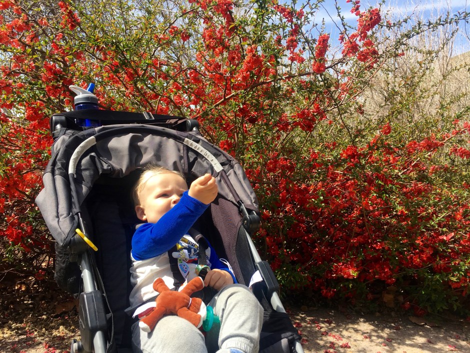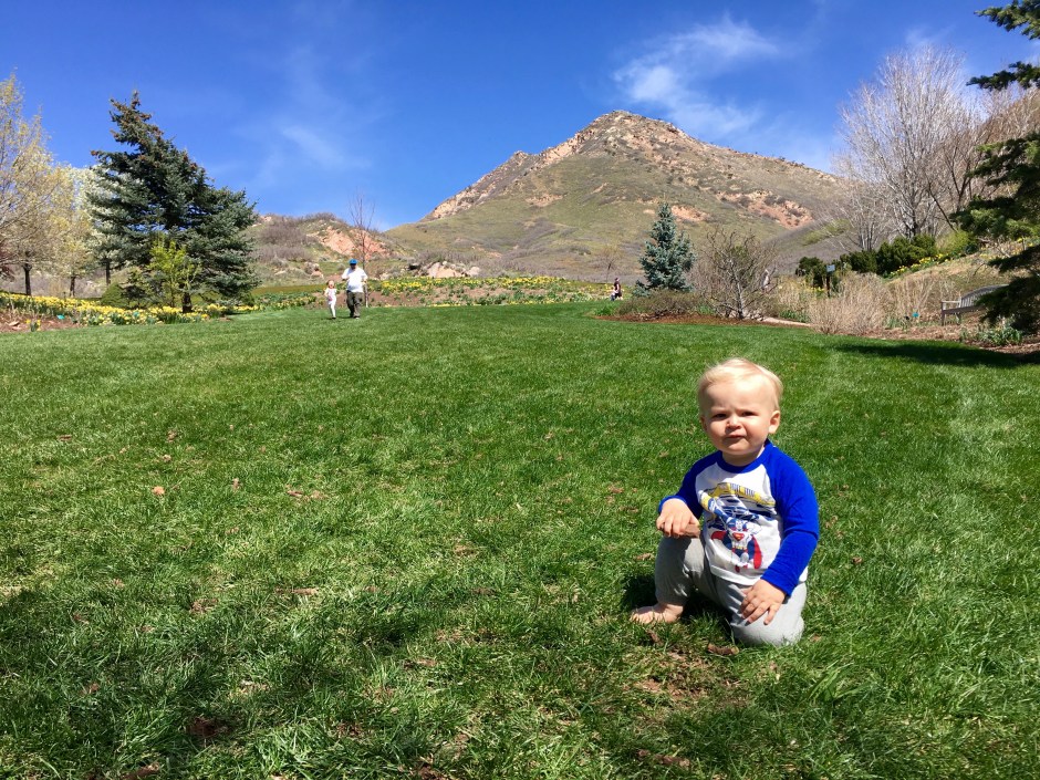 The iffy spring weather in Utah tipped over toward the warm side this week. With blue skies in the forecast and a window of time between naps, Oden and I ventured down the canyon into Salt Lake City to visit Red Butte Garden. It wasn’t his first time there; Auntie Amanda made me believe I could actually leave the house with a newborn by joining us at the Garden, almost exactly one year ago. Last summer, Oden enjoyed his first live music shows there. On Wednesday, though, we simply meandered through the just-blooming flowers, waving to the trees and making bird sounds. Eeeeep, eeeeep, eeeeep. We encountered other little humans in their own strollers doing the same thing, and all I could think was, “That mom is so happy to be out in this glorious sunshine.” Because that’s what I was feeling. The highlight of the visit to the Garden wasn’t counting daffodils or seeing a butterfly for the first time. No, it was the fact that Mommy let Oden hold a rock on the grassy area for as long as he wanted to. I watched him grab pieces of dirt and squelched my desire to wipe the mud off of his feet or fingers. I let him just experience that moment and it made him giddy. He’s a boy. He’s a baby. He’s exploring his world. He’s full of joy and wonder. I’m just along for the ride, keeping him safe, feeling grateful.