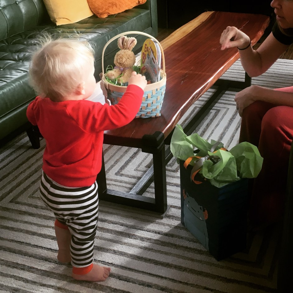 On Saturday evening, we got “dressed up” (read: Oden wore shoes!) and joined our friends at a local church for an Easter service. Oden is such a music lover and waved his party hand around during the singing part, and was content to play with other kids his age (and different toys) during the service. My only regret is that we didn’t get a family photo of us! After church, our friends came over for an Easter eve supper. We had a great time with them, and after Oden’s bath and bedtime, I kept it easy on myself by serving scrumptious quiche I’d ordered from some local bakers with a big salad. I also ordered a 4-layer carrot cake… it’s a holiday, after all!