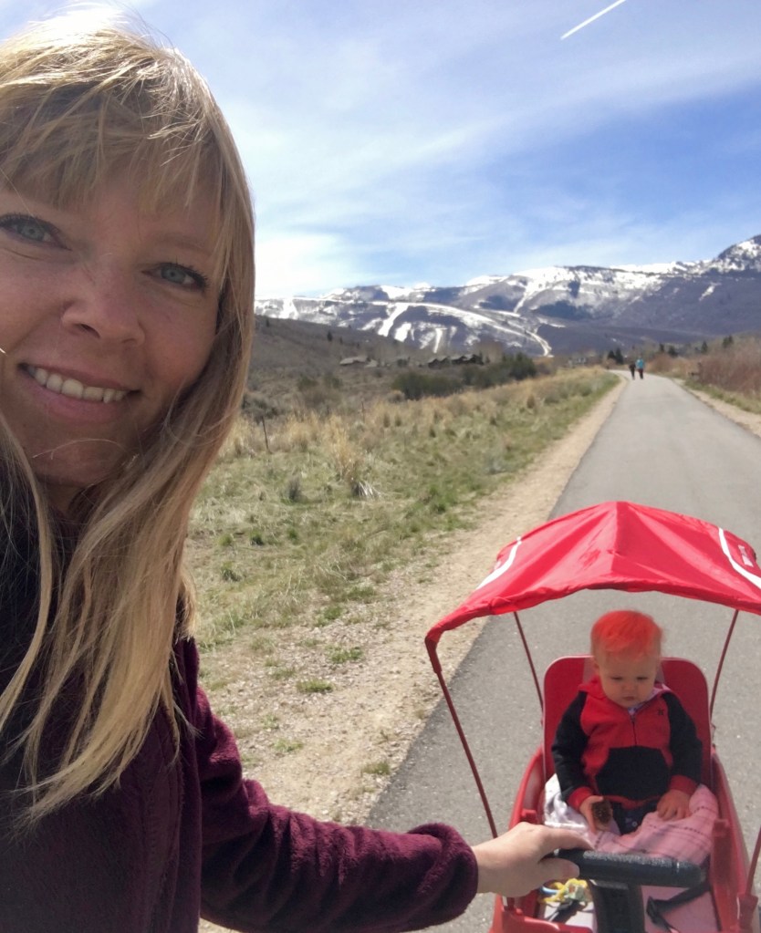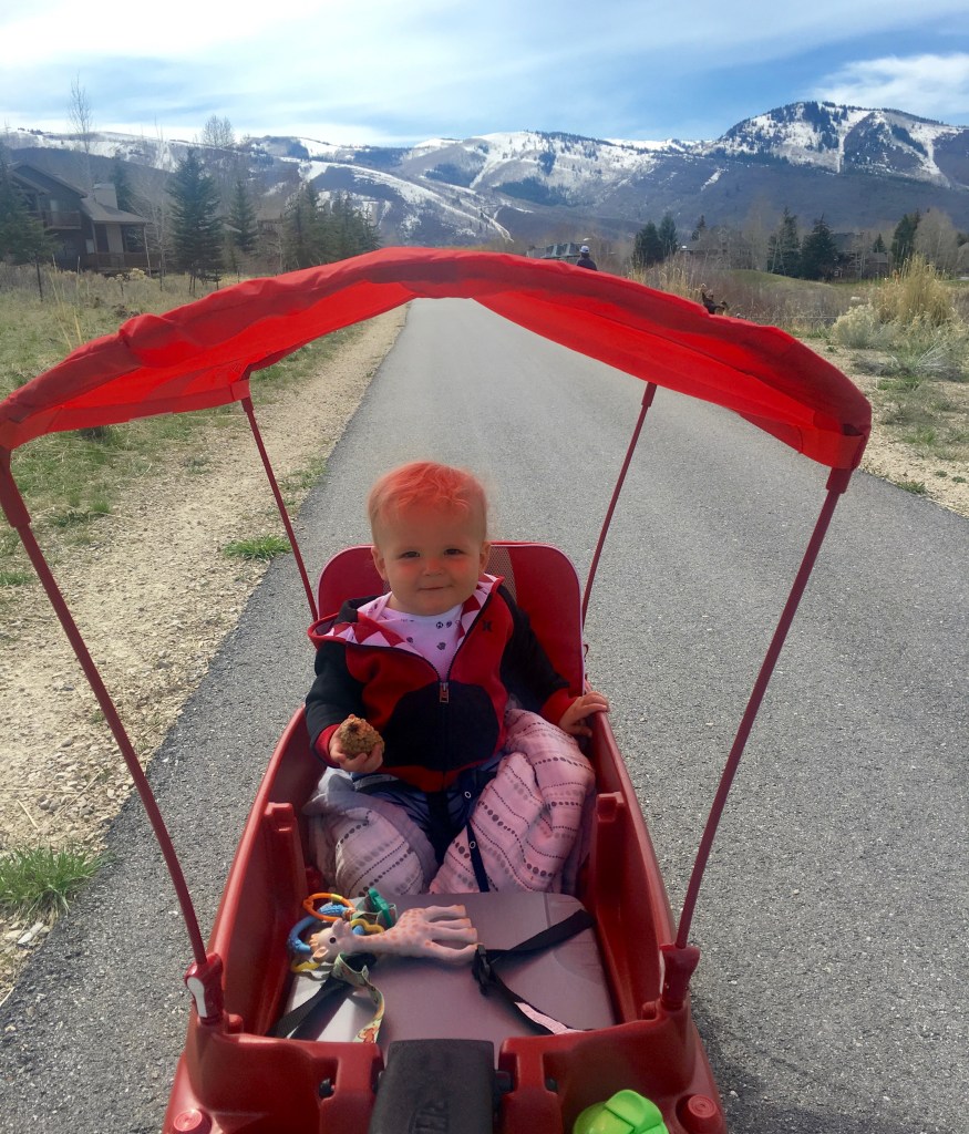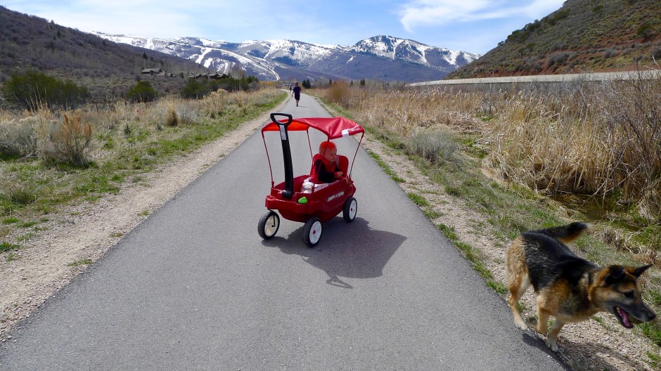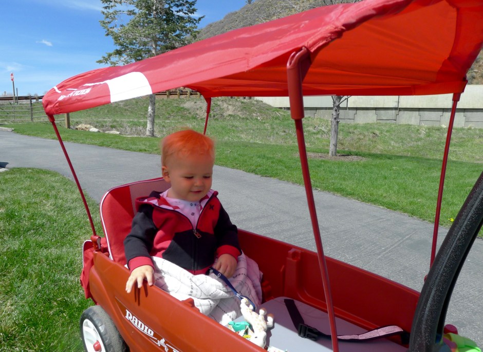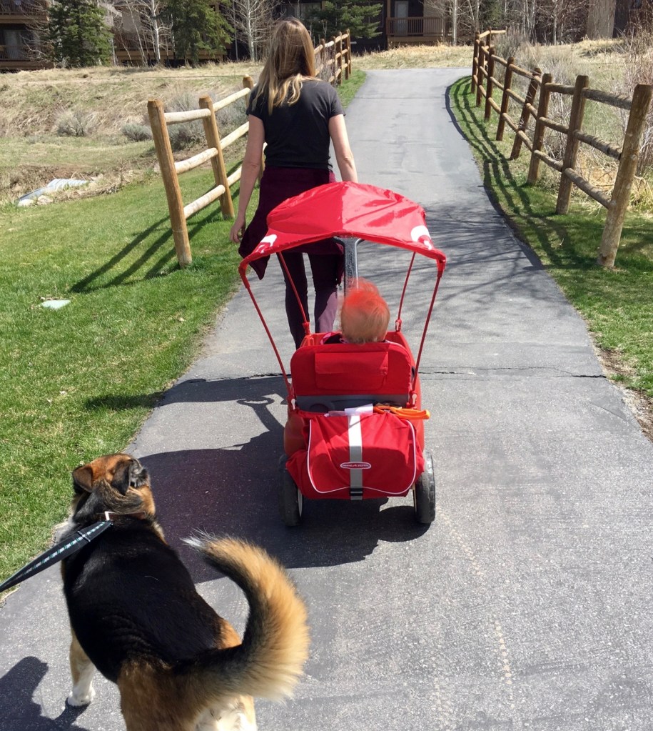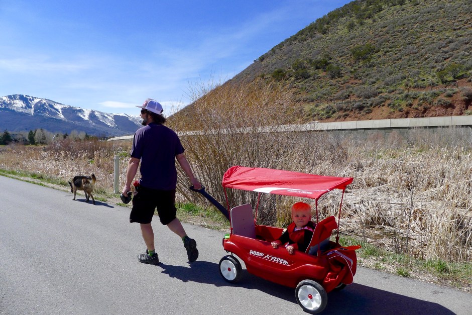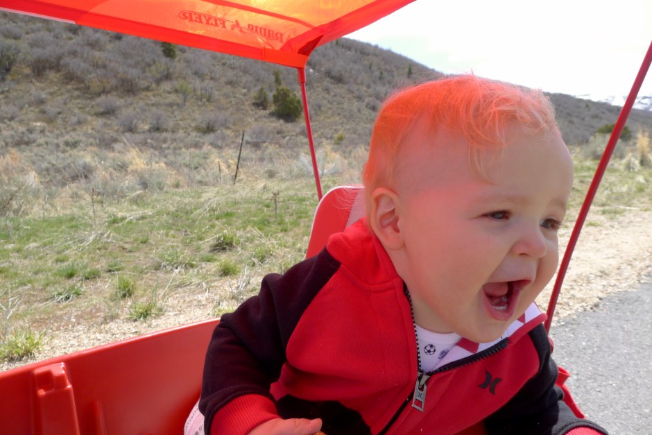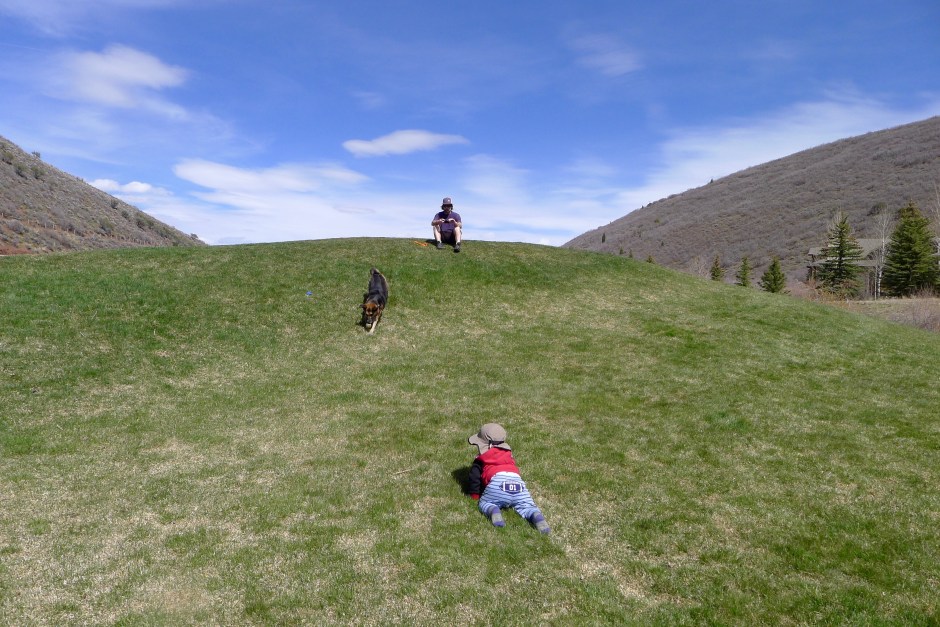 The weather was begging for an outdoor activity, so we packed up the Howe Family Circus and took a wagon walk near town. Not only has it become apparent that Oden loves being outside, but he loves that wagon! He found a pinecone and clung to it while he made bird sounds and pointed at trees. Cholula got some tennis ball time and we hung out on the grass at a park for a quick snack. Oden was brave enough to crawl all the way up a big hill to get to Daddy. I tried to get a good photo of my boys, but, well… I tried.
