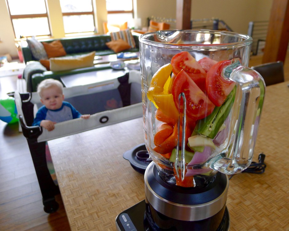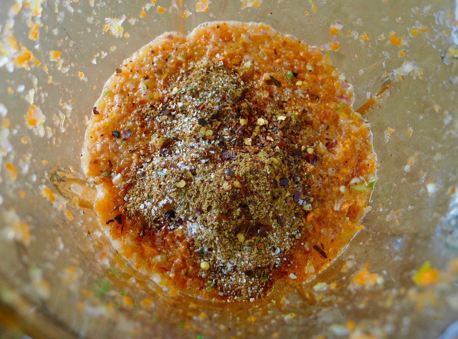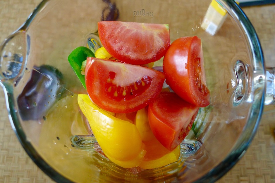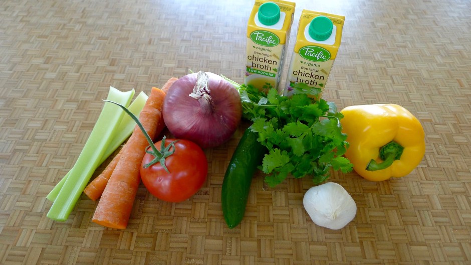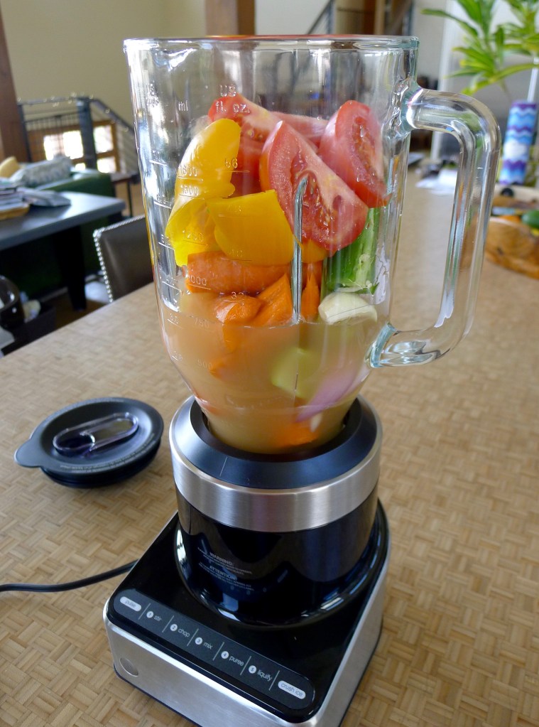 The prep for the soup is so quick. I cut some veggies into big chunks and tossed them into a blender with garlic, jalapeño, chicken stock, and some spices. I used a Braun Jug Blender and couldn’t believe how easily and quickly it whirred my pile of veggies into a puree! It put our old blender to shame!