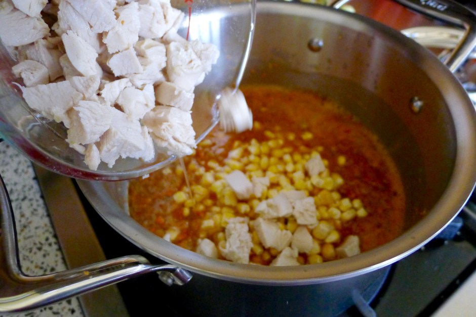 I poured the pureed veggies into a soup pot to simmer for a bit. I was excited to use this All Clad 4-quart pot. It’s the perfect size for making a small-ish batch of soup! When the soup had simmered a bit, I added chopped poached chicken and frozen corn. I let it cook for a little longer while I prepped a few toppings, like avocado chunks and chopped cilantro.