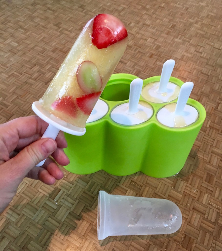 Some cool features about the Zoku molds: it stands up on its own so it’s easy to fill, and the sticks have a base that snaps into the mold to keep things in place and prevent spills. To make the pops, I added fruit to each mold, making sure that some of each one was against the side so it would be extra pretty when they were done. Then I poured the wine/juice mixture over the fruit to the “fill” line, snapped the sticks and lids into place, and popped the whole thing in the freezer. I took a peek underneath and could tell these were going to be gorgeous!