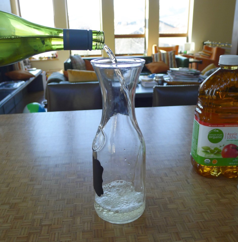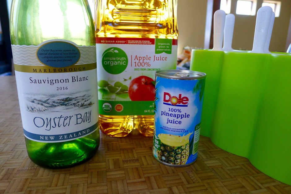 I started by cutting up some fruit, opting for grapes, apples, and strawberries. Any fruit will do, as long as you chop it small enough to fit into the mold. I wanted to be able to see the different fruits in the popsicle, so I sliced them thin. To make the sangria juice mixture, I used some apple juice, pineapple juice, and some of my favorite white wine. (I don’t care for the buttery, oaky flavor of Chardonnay and don’t think it would be as good in this sangria as a fruitier wine.)