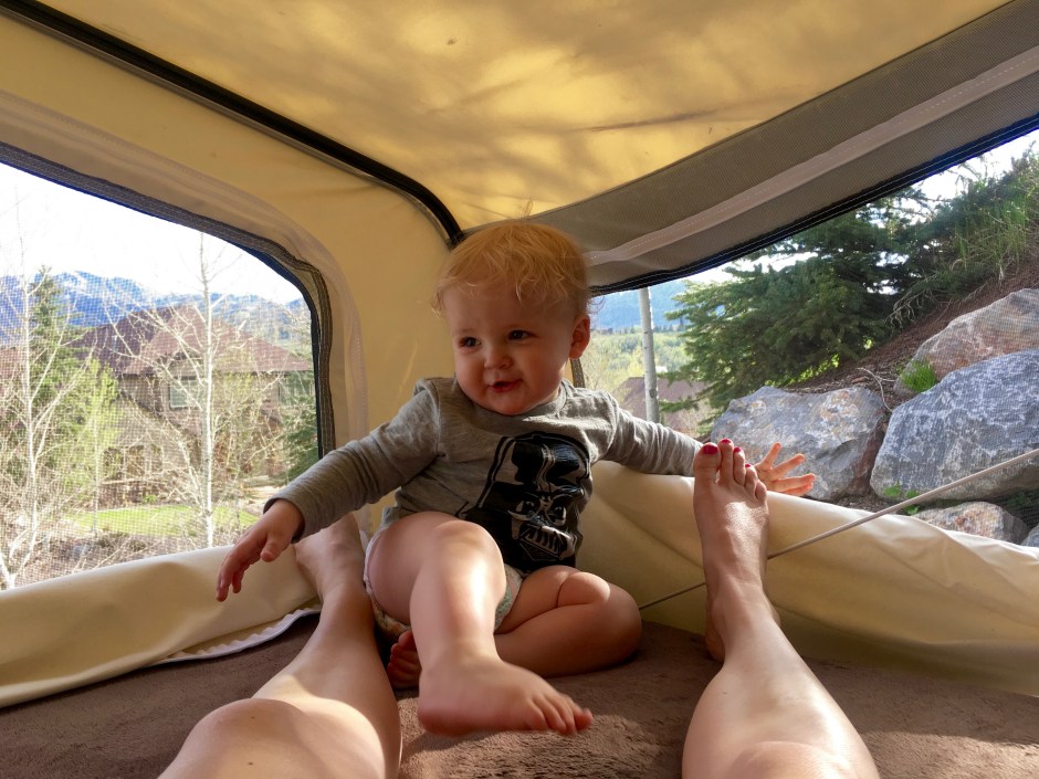 We rolled into Moab at the peak of busy-ness, around 6:30pm on Friday night. Oden had a wet diaper that needed changing and was overdue for dinner. Mama was overdue for a glass of wine. The RV park looked like a crazy, crowded scene, but we were relieved to be done traveling for the night. Unfortunately, they had no record of our reservation and the only sites left were dirt lots in between giant, generator-using rigs. It was less than ideal but we had no other option, so John backed Willie in for the night. We “set up” as minimally as possible and listened to the dirt bikes and off-road vehicles drive by all evening, which caused Cholula to bark. I had the task of trying to get Oden to sleep in all of this noise, but thanks to the sound machine we brought from home and the fact that it was nearing 9:30pm, he snuggled in with me with a bottle and was just drifting off to sleep when I heard a diesel truck backing another rig in next to us! By some miracle, Oden slept in his pack n’ play and John broke in Willie’s outdoor gas grill to make delicious grilled chicken sandwiches. Morning came early (hello, dirtbikes), but the best thing about a baby is how flexible and resilient they are. We sipped lots of coffee while he bounced around happily on our bed. I took Oden on a stroller walk and did some incredible people-watching while John packed up camp. I had visions of the dreamy scene awaiting us in a few short hours. We left as soon as possible- Colorado or bust!