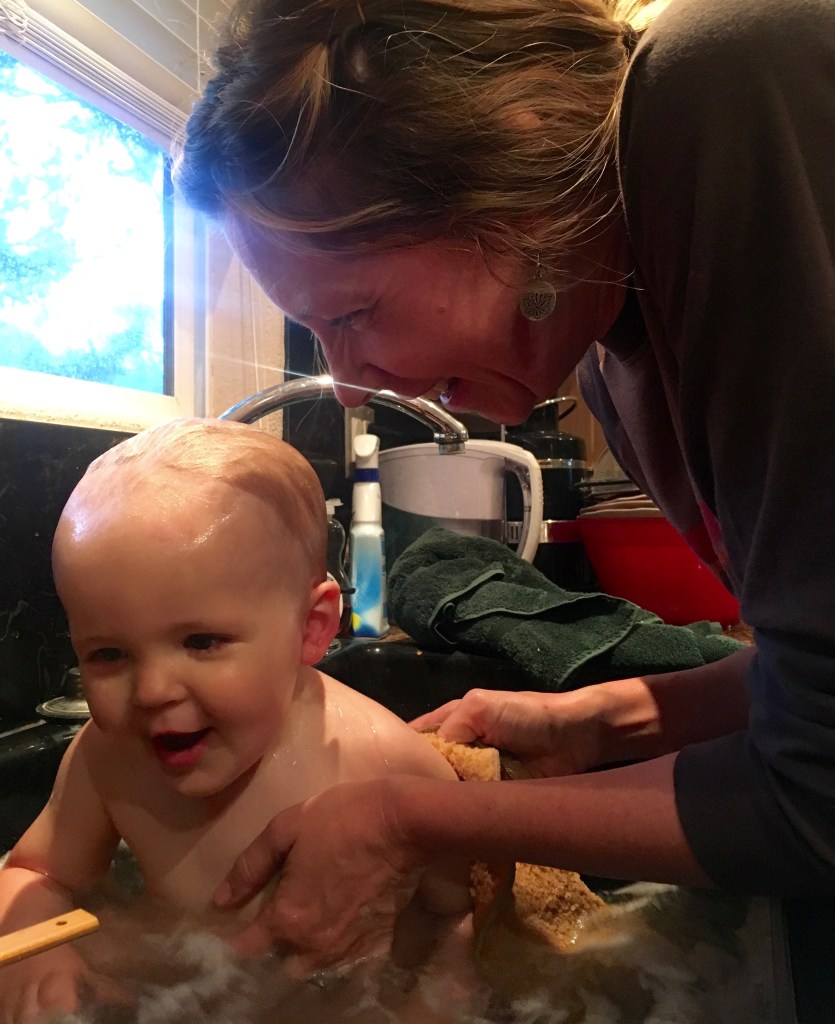 My parents’ house has a fabulous yard that feels like a park. Everything was green and in bloom and it was such a relief to have reached our destination! They say, “Home is where your Mom is.” There was even a home-baked apple pie on the stove when we walked in, made with apples from the trees in the yard. We spent a glorious afternoon relaxing with drinks in the shade, watching Oden play with a rake, a lacrosse stick, tennis balls, pinecones. Before bed, we plopped our dirty little toddler in the kitchen sink. I’ll always remember that bath in Grandma’s sink!