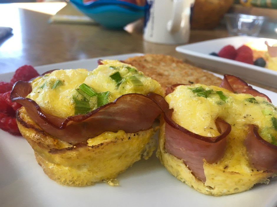 I was glad I’d sprayed the pan well with the cooking spray because the ham didn’t do the best job containing the egg mixture. That said, the little egg cups were adorable! I’d intentionally left them simple in case Oden thought they were yummy (the jury is still out), but you could jazz up the spices or add veggies to the egg mixture. Anything goes!