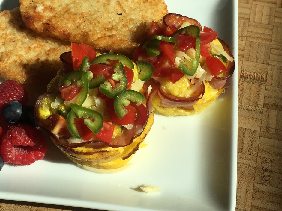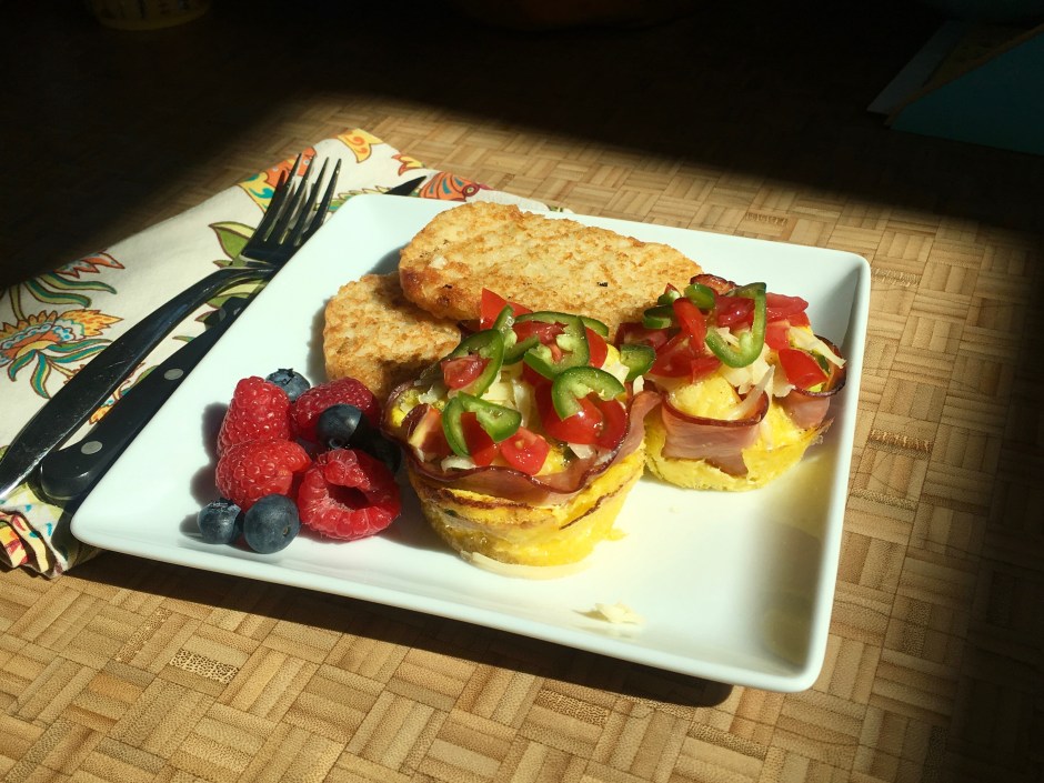 For brunch, I topped our egg cups with some chopped tomatoes and jalapeños for spice. I served them with fruit and those cute little hash brown patties (thanks, Trader Joe’s!). They were scrumptious!