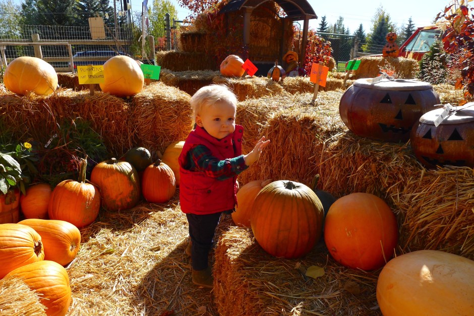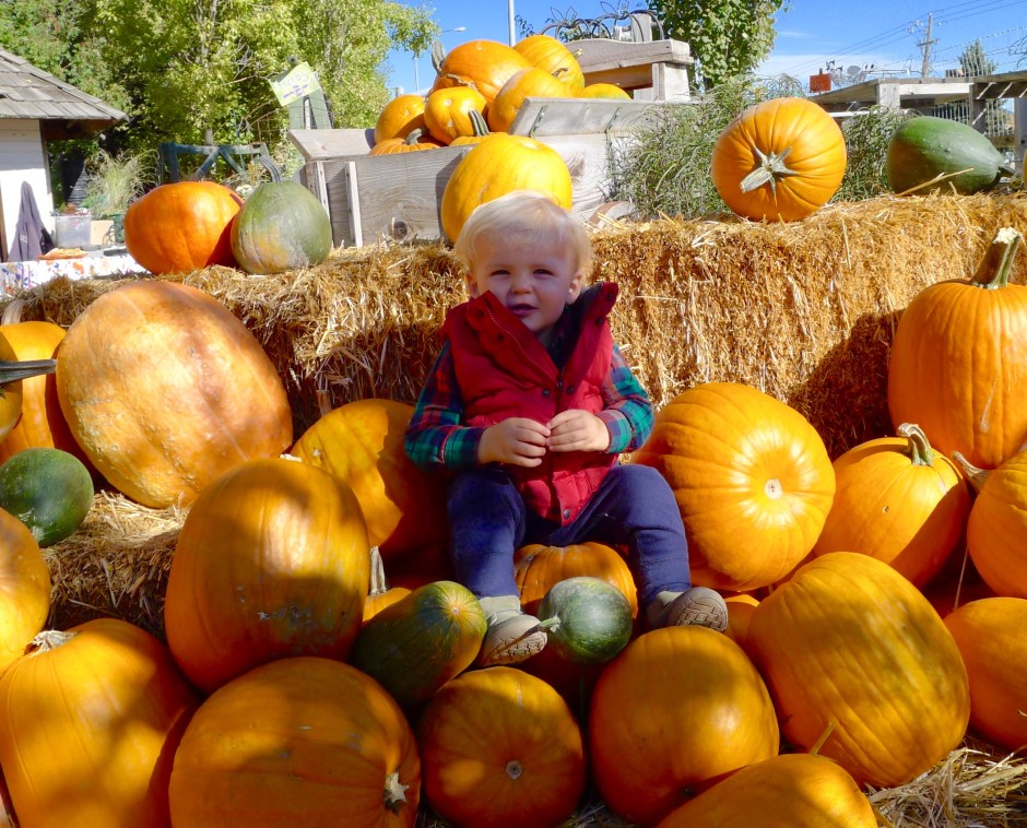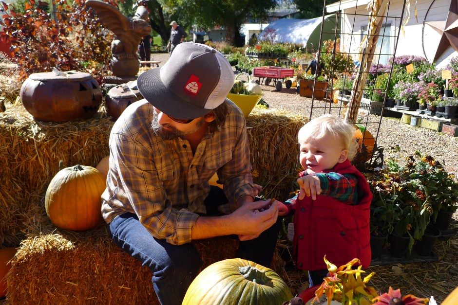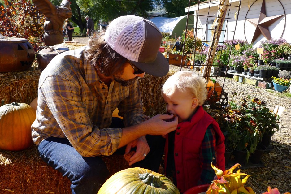Our “happy baby” window was closing as we approached Oden’s lunch time, so we went back to the pumpkins and picked out a few good ones for the front stoop. There was hot cider, coffee, and a plate of yummy treats for patrons, so John and Oden shared a bite of pumpkin bread while Mama selected a few additional décor items. When it was time to go, Oden turned from a little angel to…well, a hungry, tired toddler and treated everyone from here to Wyoming to an epic meltdown. It was the only dark spot on an otherwise fun family morning!