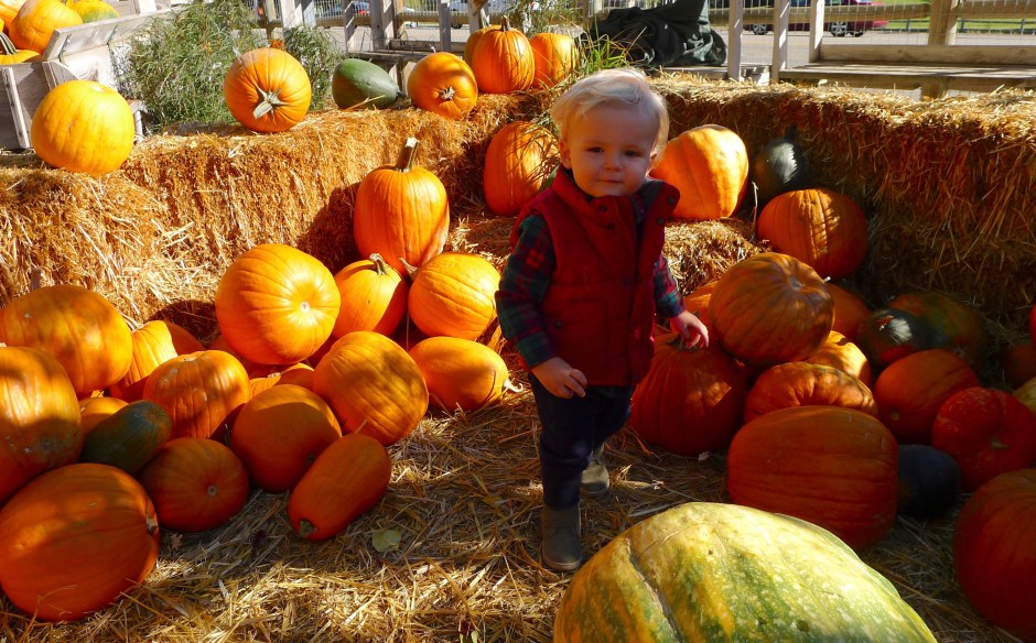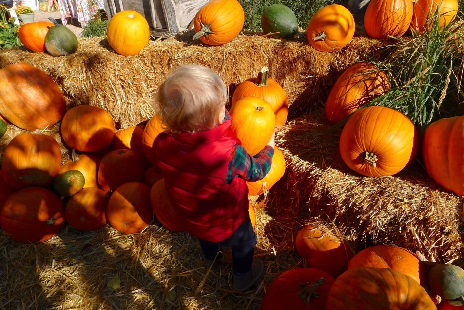 In addition to pumpkins of every size, shape, and color, the grounds were full of mums and unique seasonal décor. They’ve created a little maze using bales of hay, filled with thoughtful little areas for photos here and there. We let Oden run around and check things out, trying to snap photos of him along the way. He’s only this age once! He sort of cooperated for pictures, but as seems to be the norm these days, he was on the move again before we could say, “Cheese!” It’s so fun to see him exploring his world with wonder and confidence.
