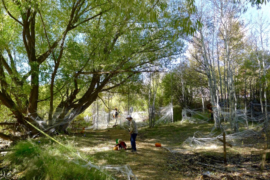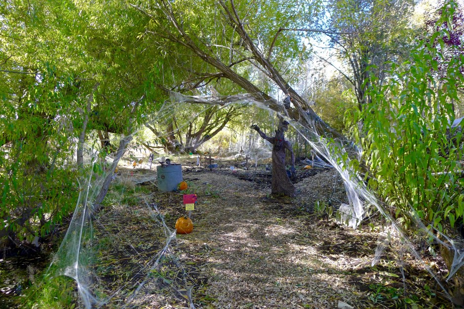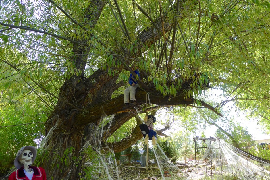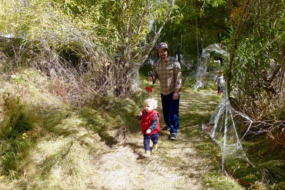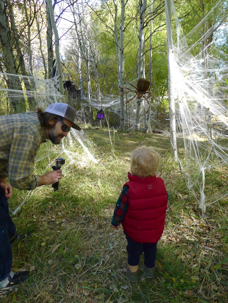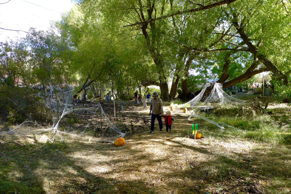 Around the back of the property, we discovered a little “Haunted Forest” with spider webs and spooky sounds and other creepy things. The scariest moment for me was looking around at the fake skeletons and giant spiders, then glancing up and seeing a real kid above us in a tree! I’m not a fan of the part of Halloween that focuses on fear and death, so we wandered along with Oden and made sure nothing was frightening. He’s a brave little kid, and even the giant blow-up dragon didn’t give him a scare. He just roared at it, waved and said “Hi!” in his cute baby voice, and moved on. (I learned that it’s because they’d already seen Mr. Dragon multiple times during daddy-son trips to Home Depot lately!)