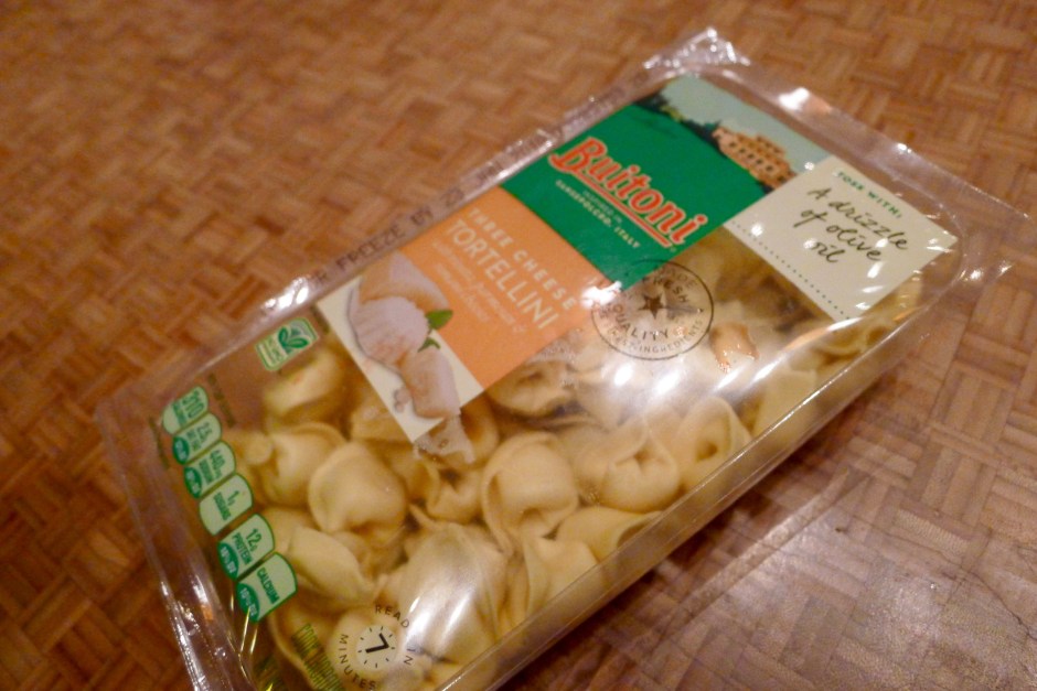 - 1 8-ounce package of fresh refrigerated cheese tortellini