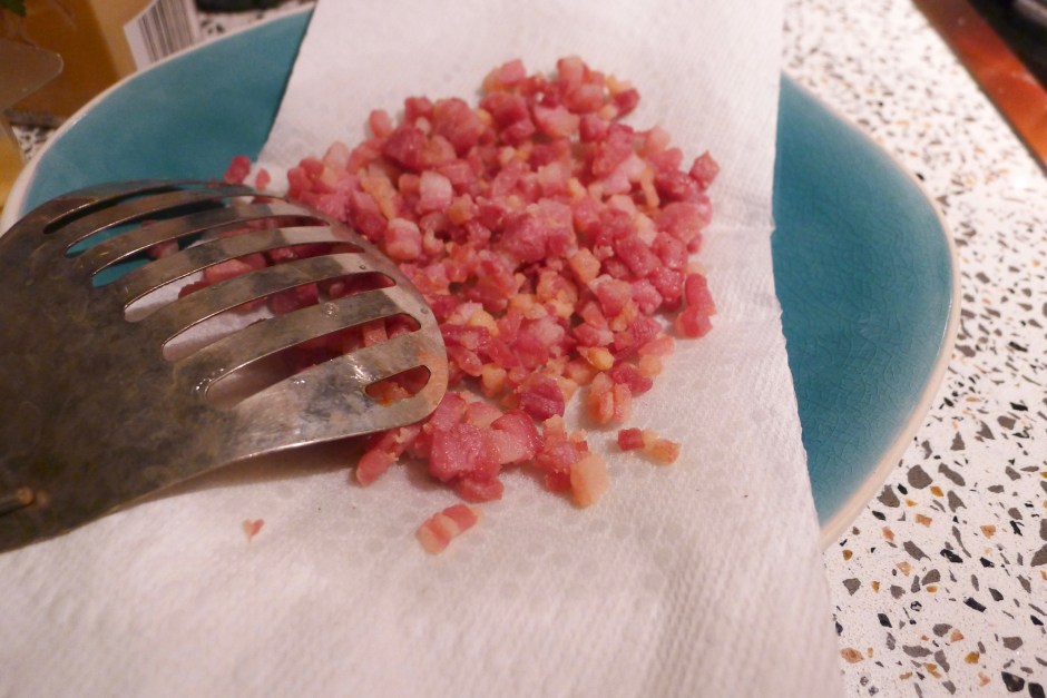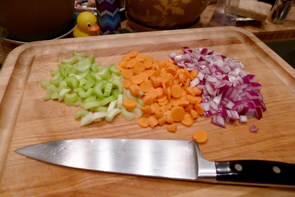 While Daddy and Oden found a game to play before the little one’s bedtime (likely involving a ball or jumping on the couch or a father-son dance party), I removed the pancetta from the pot and set it on a plate lined with a paper towel. I swirled a bit of olive oil in with the pancetta drippings and added my colorful veggies. Vibrant food always tastes better, especially when winter becomes drab and lacks color.