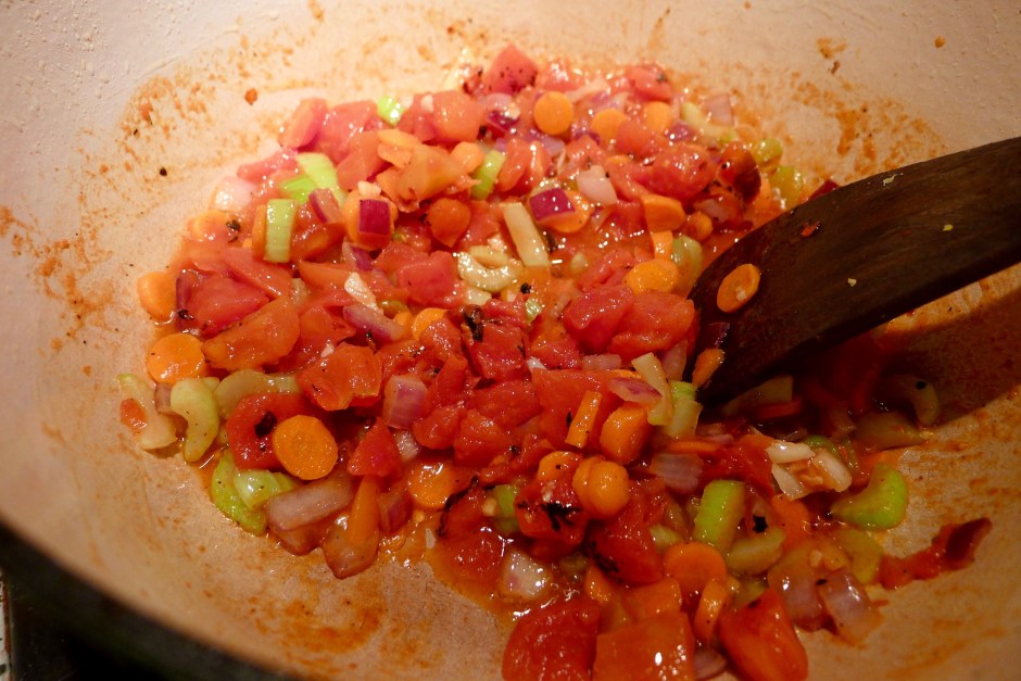 After a few minutes, I added the garlic and also the can of tomatoes. I chose the fire-roasted version for a bit more flavor. I sprinkled in salt, pepper, and crushed red pepper flakes. I let the veggies and seasonings to mingle for a few minutes before adding chicken stock, cannellini beans (white kidney beans), and the cooked pancetta.