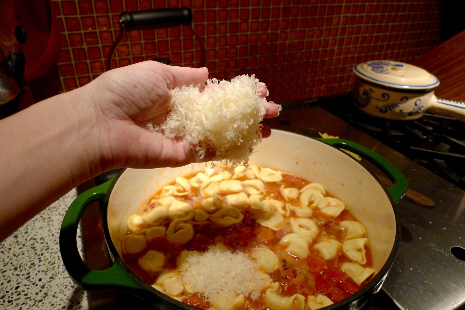The last things I stirred into the soup were the spinach and a big handful of Parmesan cheese. I sprinkled more cheese on top of each bowl of soup (why not?!) and we sat down to eat. I love how the spinach adds a pop of green to an otherwise reddish broth. The tortellinis float to the top and whisper, “Eat me!” Yum!