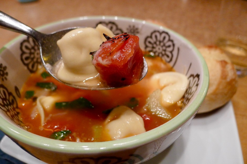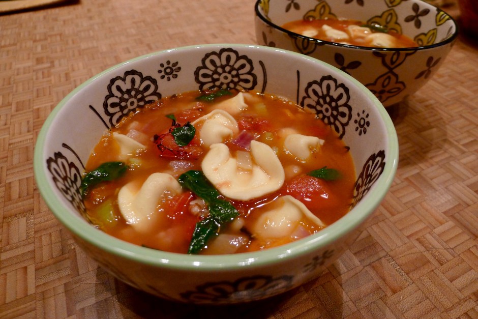 A few minutes before I was ready to serve the soup, I added a whole package of cheese tortellini. I used the fresh refrigerated kind, which I keep in the freezer. It cooks within a few minutes- just long enough for me to butter some crusty rolls and pop them into the toaster oven!