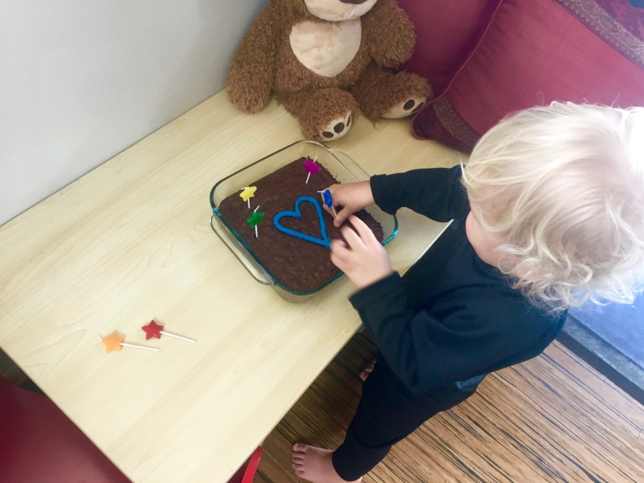 Christmas is John’s birthday. Oden helped decorate a pan of brownies for Dada.