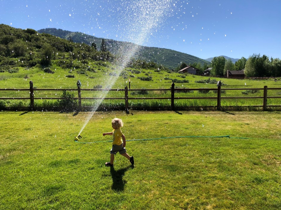 The automatic sprinklers in our backyard have been behaving oddly, so we brought out the kind that screws into the hose. That’s automatic fun on a hot day for a 2-year-old! Once he realized he was supposed to run THROUGH the water and not around it, it was game on. Cholula nips at the water and Oden shrieks as he tries to outrun the spray. Even John did a few laps through the water to cool off, which delighted Oden to no end! One moment he’s fully clothed but before we know it, there’s a naked toddler streaking through the water!