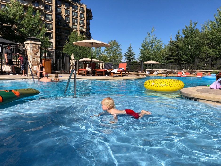 Since Oden’s nap zone would have workers going in and out all day, we decided to take advantage of the local’s discount at a hotel nearby and have a little staycation. The main draw to the St. Regis Deer Valley with a toddler involved? The pool, of course! We’d recently visited the pool when a friend of mine was in town at the hotel overnight and Oden adored the shallow shelf to splash around on. Plus, how cute is the unicorn floatie he rode with our friend, Sydney?