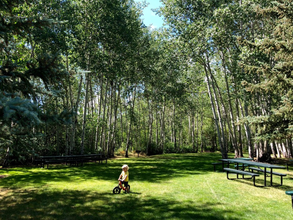 I’ll share a recap at some point when I can raise my head above water. (Side note: this pregnancy is kicking my booty!) One of the fun items we crossed off this summer was a picnic when my folks were visiting from Colorado way back in July. We had an unexpected break in some rain and decided to head outdoors for lunch. We kept it simple with pre-made food and packed up fried chicken, salad, fruit, chips, cookies and drinks. We toted along some of Oden’s balls, some bubbles for blowing, and his little strider bike. We headed for Rotary Park, which is shady and has a creek running alongside of it. We had the park to ourselves and the sky could not have been bluer! Oden explored the grounds on his little bike and searched for fish in the creek. Even the dogs had an adventure- Cholula stalked a squirrel for most of the day! This park is so close to home, which made it low-effort but still a special lunch. After a couple of days of rain, we soaked in that glorious summer sunshine, and the grass and trees were so vibrant. Take a peek at some photos from our family picnic!