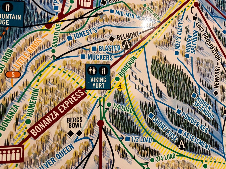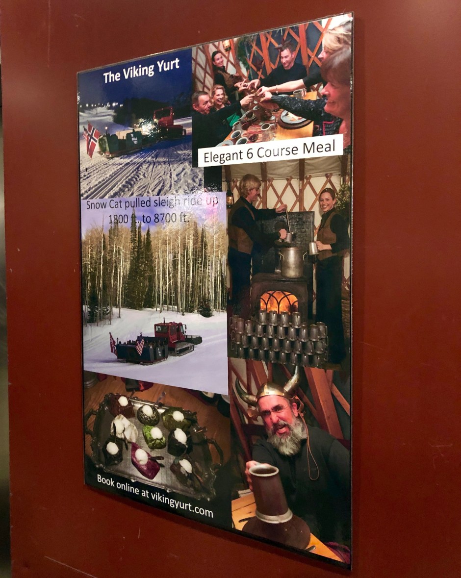 We hung out in the lobby by the Guest Services Desk, signing a waiver and chatting with other yurt-goers. I met a sweet woman from Virginia whose son had surprised her with the dinner for her birthday the day before. There seemed to be a healthy mix of locals and tourists, less than 50 people in all. A peek into the ski shop and listening to guests at the resort talking reminded me that we live in a place people want to come for vacation! While we waited, John pointed out the ski runs he likes best on the huge trail map on the wall. I spied the Viking Yurt high on the mountain, but had no idea what to expect.