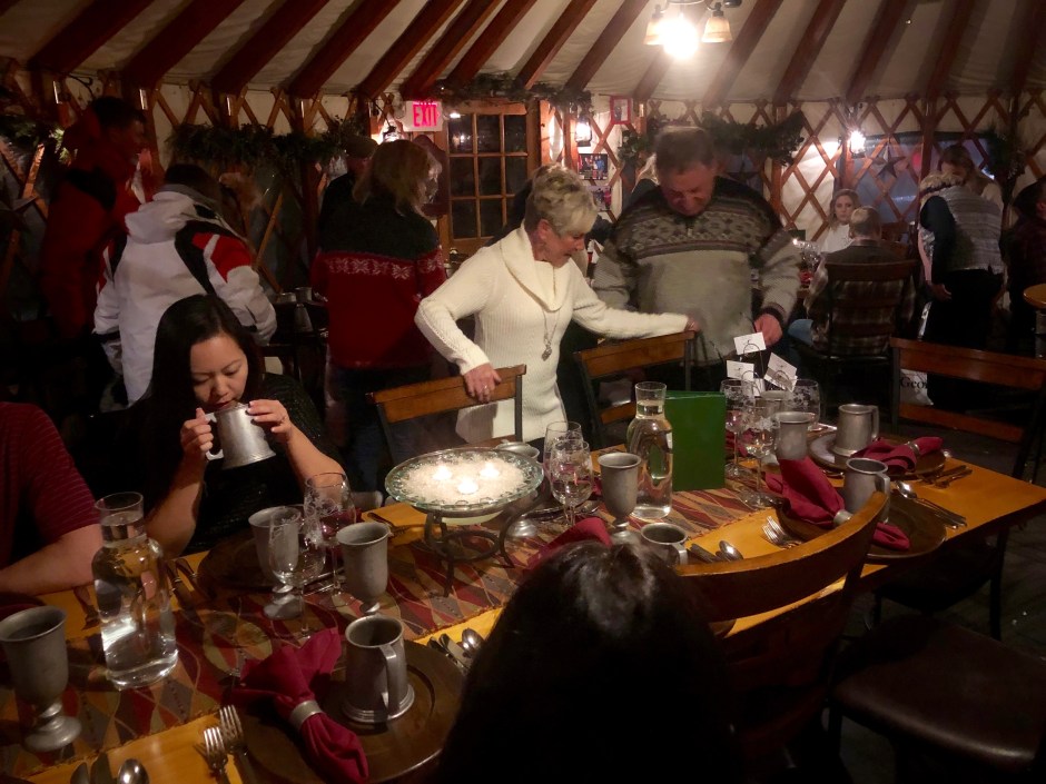 Someone rang a cowbell to get our attention and introduced the staff for the night. We learned about glogg and were offered an alcoholic beet-based shot to pour into it, served to our tables on a “Shot Ski.” We all clinked our mugs and shouted, “Skol!” which is like “cheers” to a Viking. When in Rome…! We spent the evening meeting and chatting with our table mates, none of whom had ever had a yurt dinner experience, either. To my left was a couple who’d just moved to Utah from LA three months ago. We bonded over my LA roots and the fact that we both have 2-year-olds. At the end of the table was another local couple (it was his birthday) and a pair from New Jersey who’d just gotten married nearby on Saturday! To John’s right was an older couple who visits almost annually from Michigan. After the zero-degree temps they’d had at home recently, they laughed and called our weather “balmy.” It was pretty incredible how well the wood stove warmed the small space while the wind whipped just outside the canvas walls!