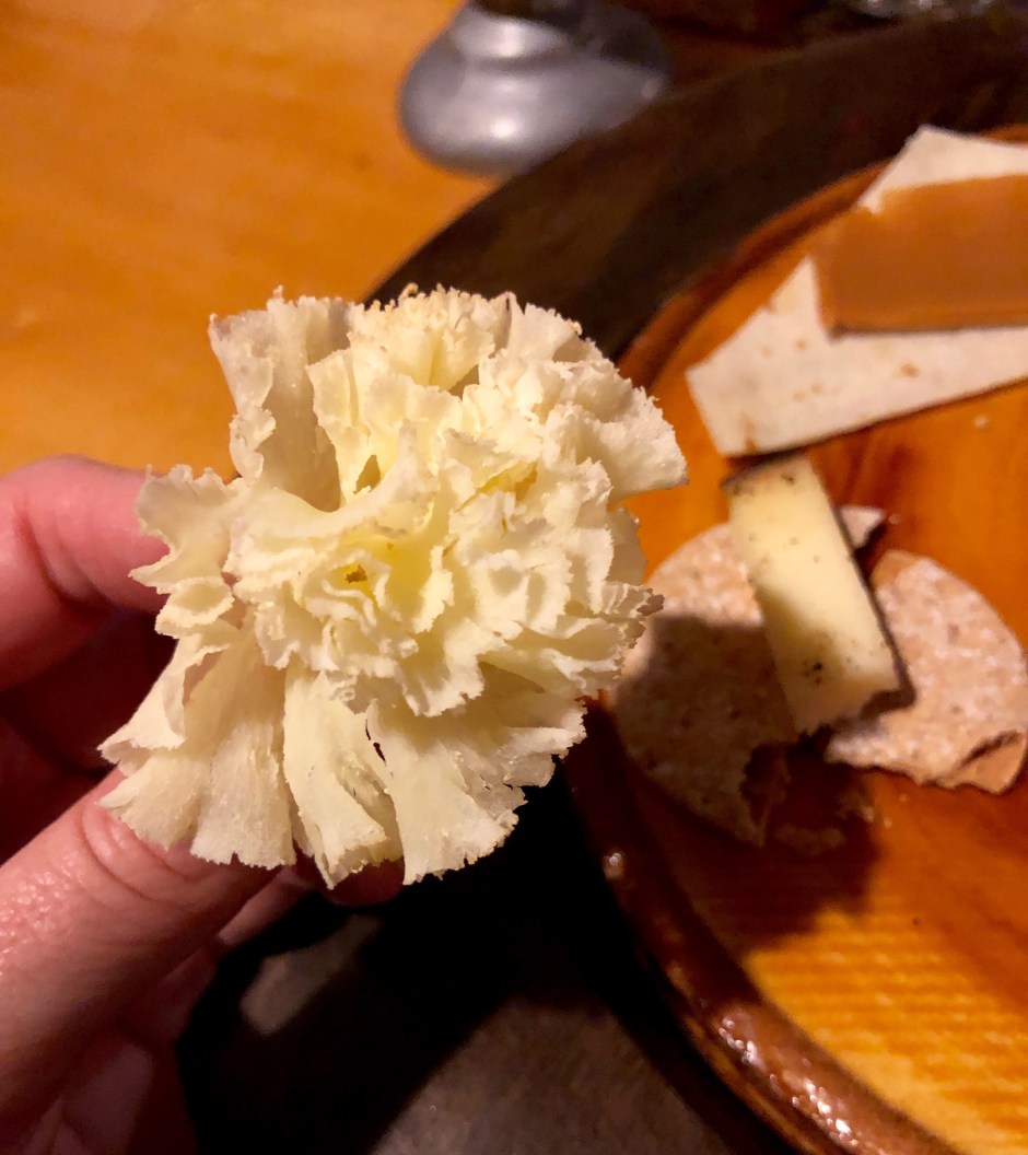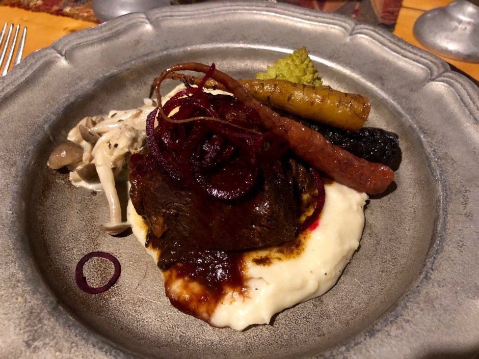 For our main course, we thoroughly enjoyed braised short ribs with Jarlsburg mashed potatoes (John’s in love) and winter root veggies. It was scrumptious! Despite feeling pretty full by then, we dove right into a simply beautiful cheese course, served on a local aspen slab. The staff described everything we were eating, like what types of cheeses were on the plate and where they were from. At some point, the Viking helmets started being passed around, prompting all sorts of laughs and photo opportunities. With John’s full beard, I think the get-up suits him, don’t you?