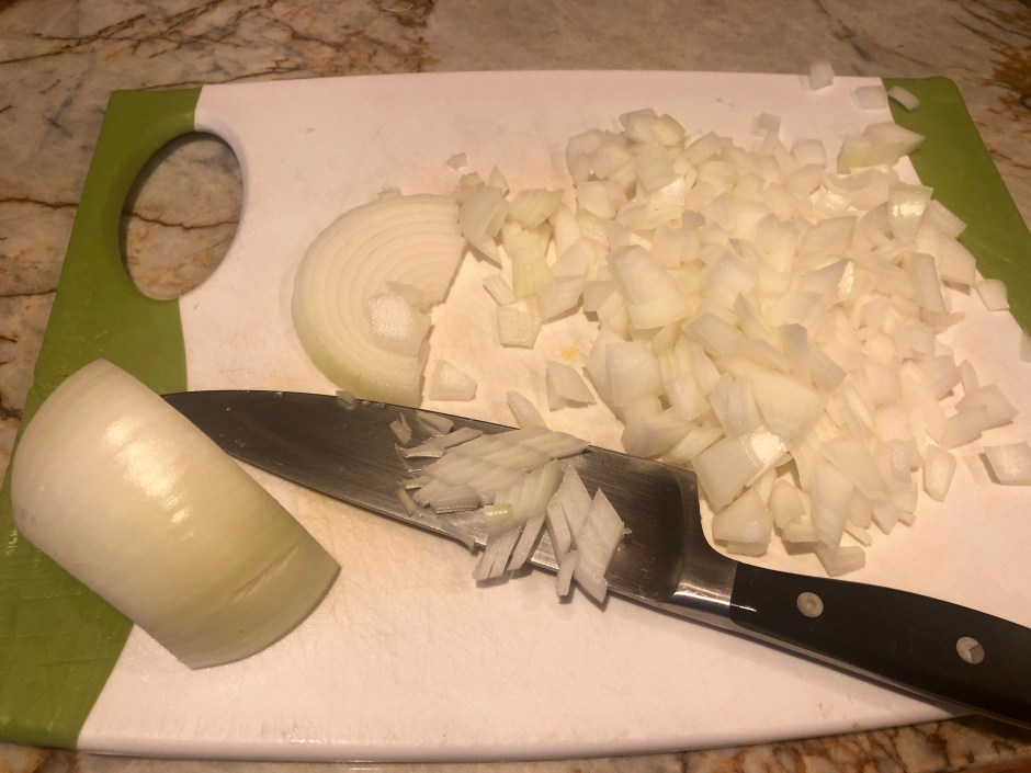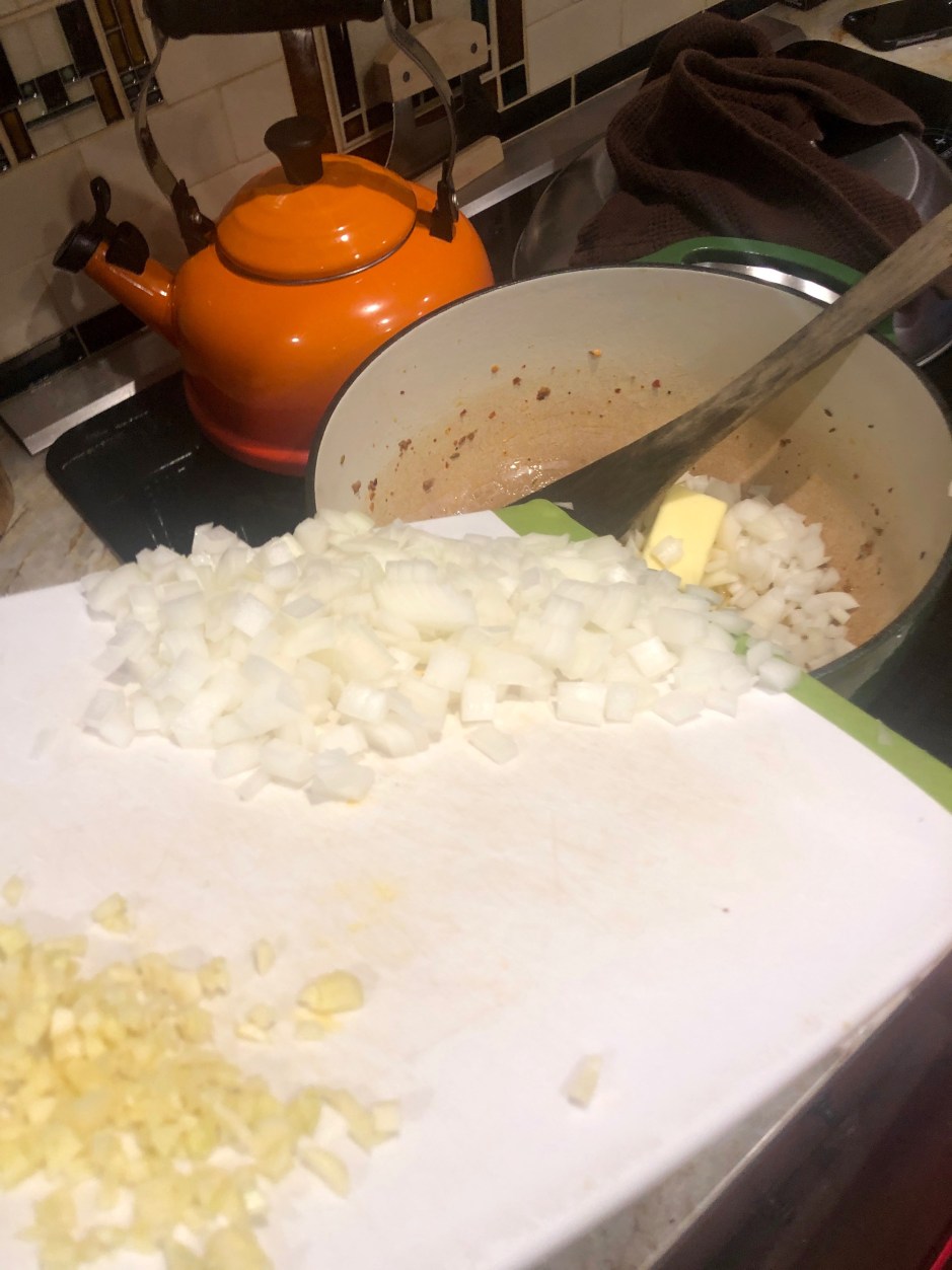 I started by browning some Italian sausage in my big green Dutch oven. It’s amazing how much flavor sausage gives to a recipe, and I always use the spicy version because we like heat in this house. I removed the sausage, dropped a tab of butter into the pot, and slid some chopped onions and garlic into it. Ahhhh- there was that familiar, yummy aroma that meant something GOOD was happening in the kitchen!