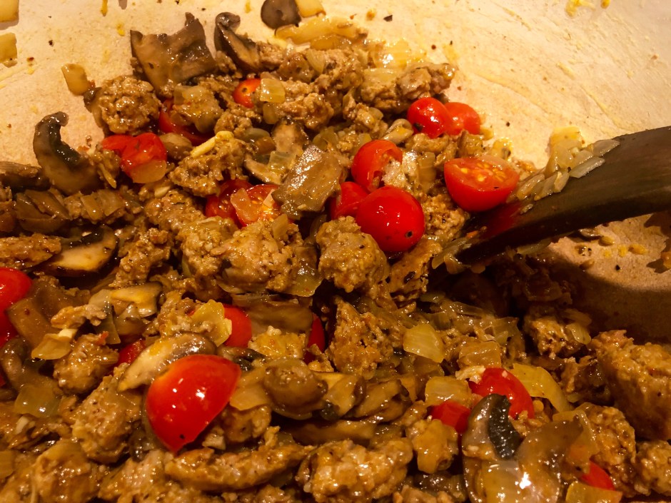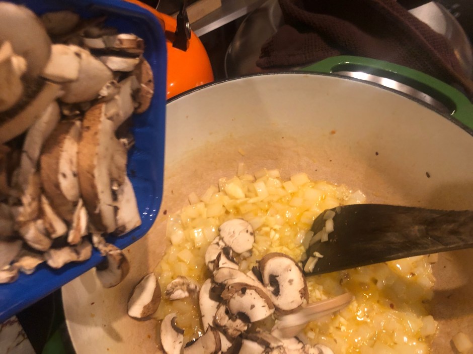 Next, I added a package of pre-sliced brown mushrooms into the pot with the onion and garlic. Buying them sliced saved me some time and made this quick recipe even quicker! When they’d softened, I added the cooked sausage back into the pot and turned the heat way down. It was time to tag-team Oden’s bath and bedtime routine with John, feed the dog, and nurse Morrison. Another thing about parenthood: you learn to juggle!