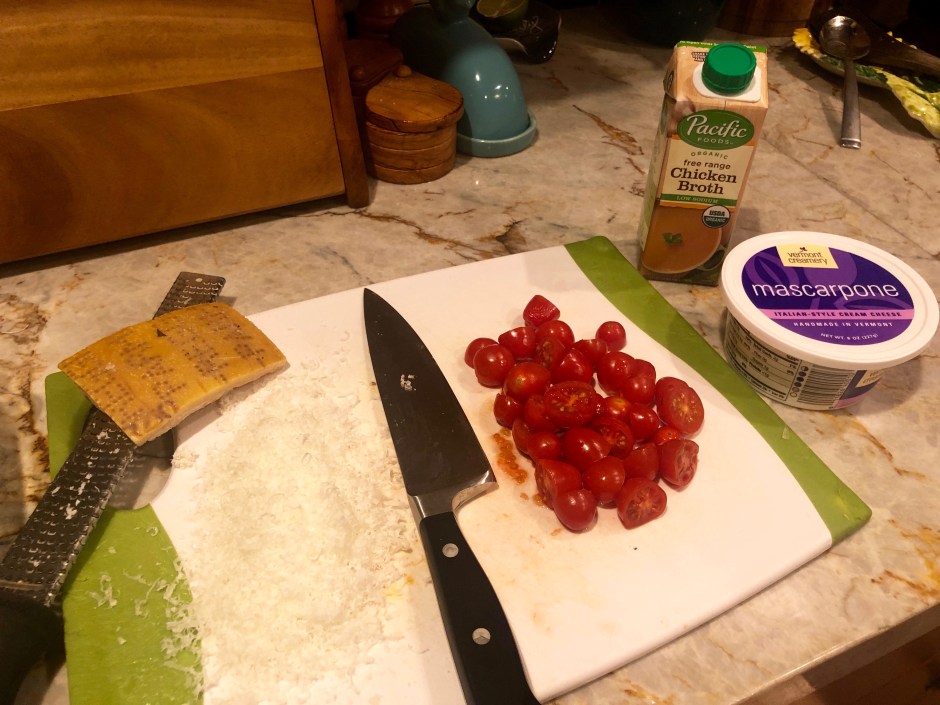 While John sang Oden to sleep (swoon), I got some water boiling on the stove for the pasta. I used what I had on hand, a small pasta called cavatelli. While it cooked, I got out a tub of mascarpone cheese and some chicken stock, halved some cherry tomatoes, and grated some Parmesan cheese. I also pulled some arugula out of the fridge.