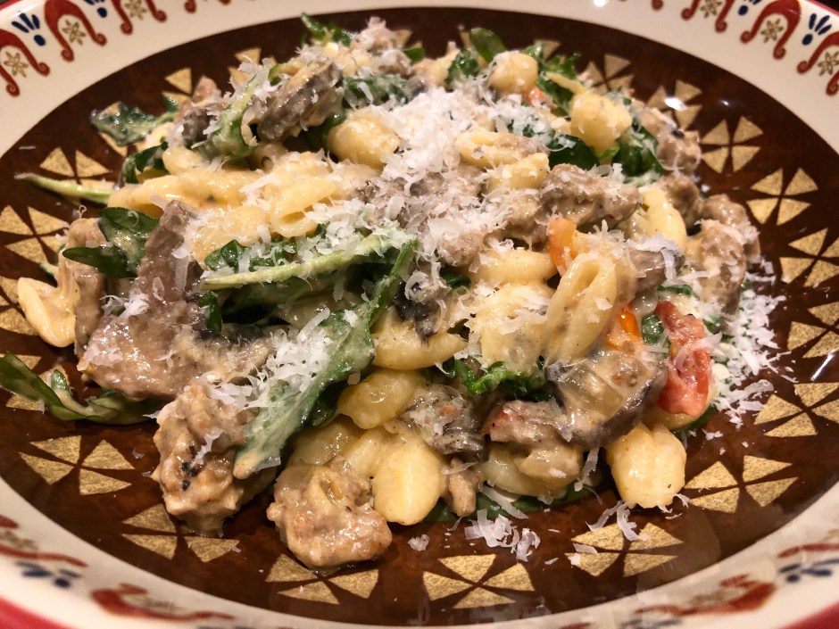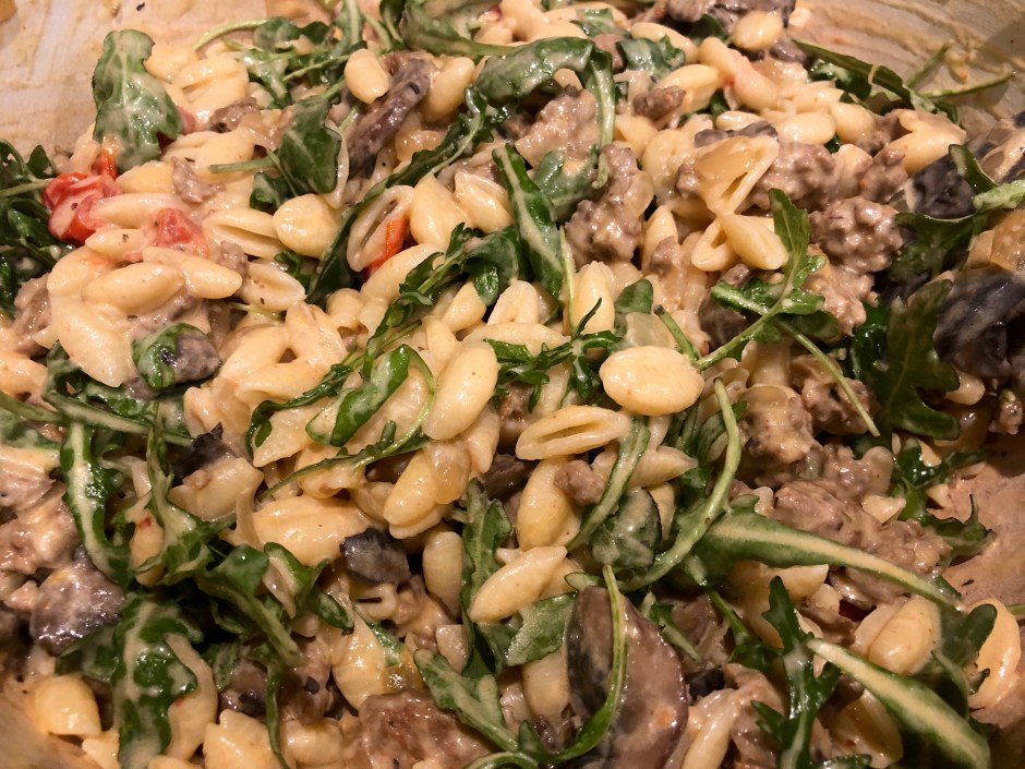 Bring a large pot of water to a boil and make the pasta according to the directions. Drain it and add it to the sausage mixture. Scoop in the mascarpone cheese and the arugula. Mix well with a few splashes of the chicken stock until the creamy sauce is your preferred consistency. Serve topped with plenty of Parmesan cheese and don’t forget some buttery toasted bread on the side. Yum!