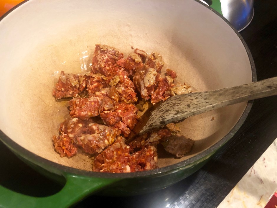 In a Dutch oven or soup pot, heat a few swirls of olive oil over medium high heat. Remove the sausage from its casing, add it to the pot, and brown. Remove it and set it aside.