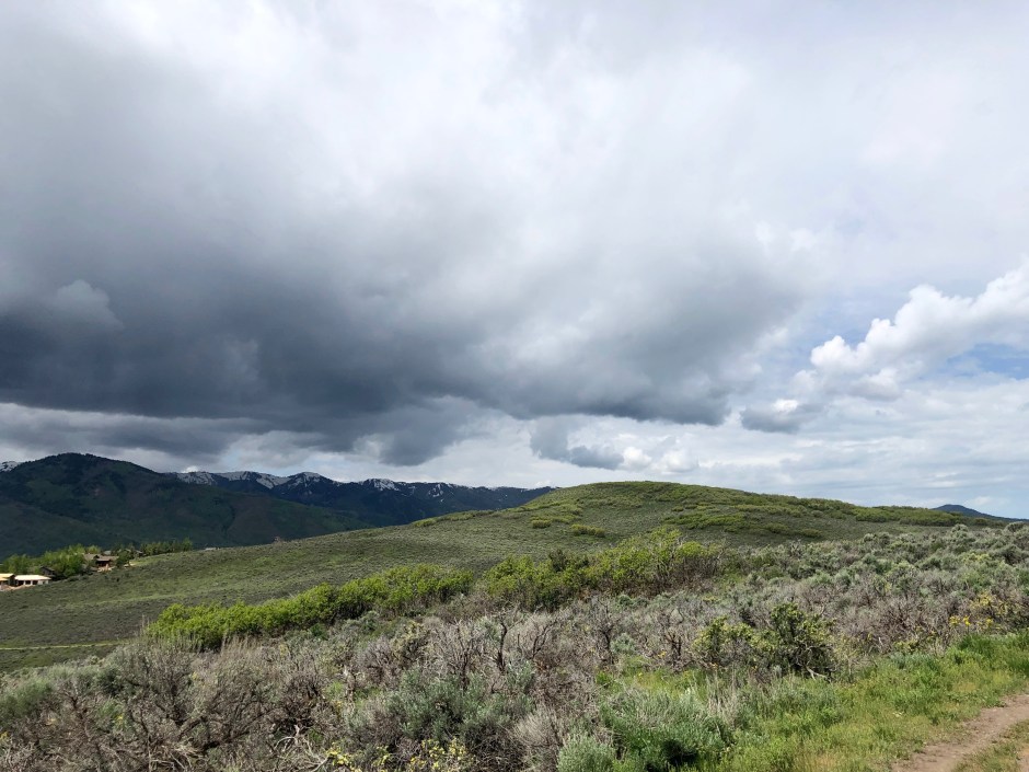 Having a baby in the beginning of December in a huge snow year meant a LOT of time indoors over the winter. There weren’t the stroller walks or early spring hikes with Morrison that I enjoyed when Oden was born in March a few years ago. This was the first real hike of the season for me, and I wound higher and higher up the hill, despite the ominous thunderheads building over town. Where does this leg of the trail go? Let’s just go up around the bend. Look at those patches of snow still on the ski runs! Every few minutes, I’d whistle for Chewy, who’d have her nose deep in a vole’s hole or was chasing an imaginary mouse through the brush. Once, I had to scold what looked to be an old rabbit leg out of her mouth. Dogs are gross. But whatever, that was her journey- her version of a fabulous hike. I paused to take a photo or two and picked a fuzzy dandelion, making a secret wish before I blew it away into the breeze.