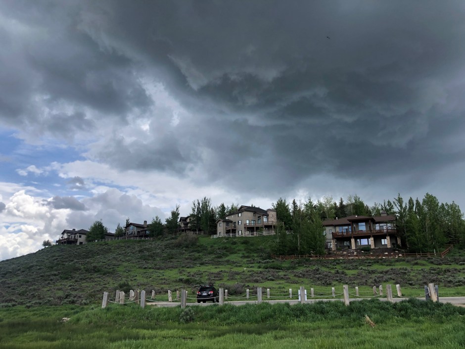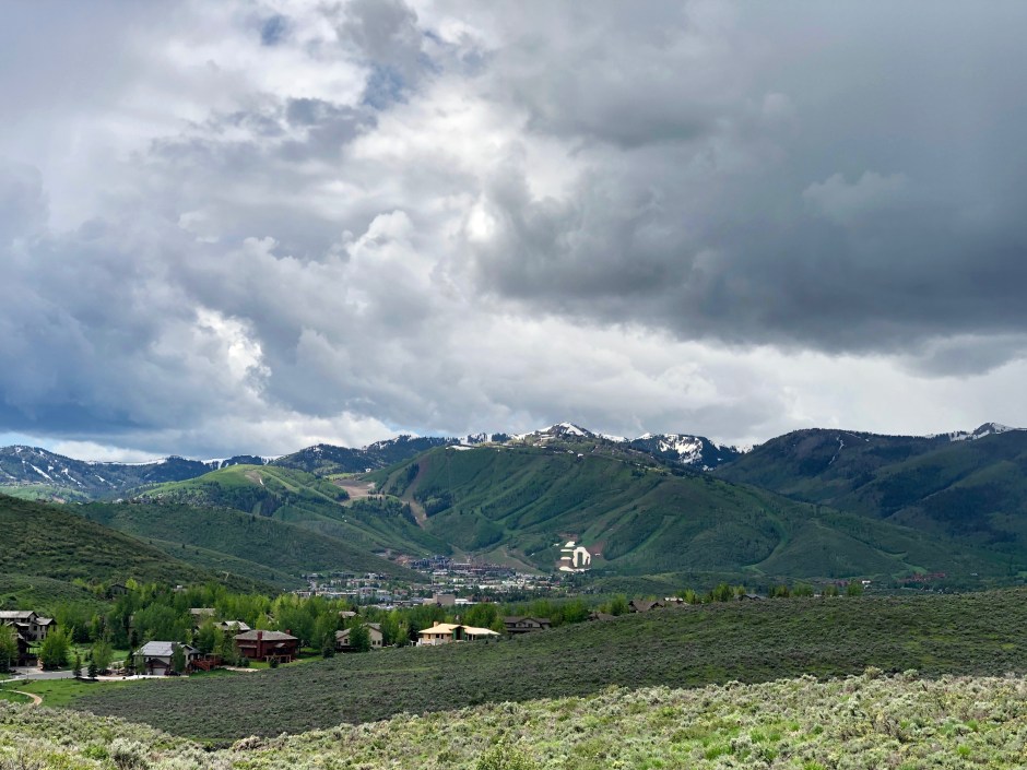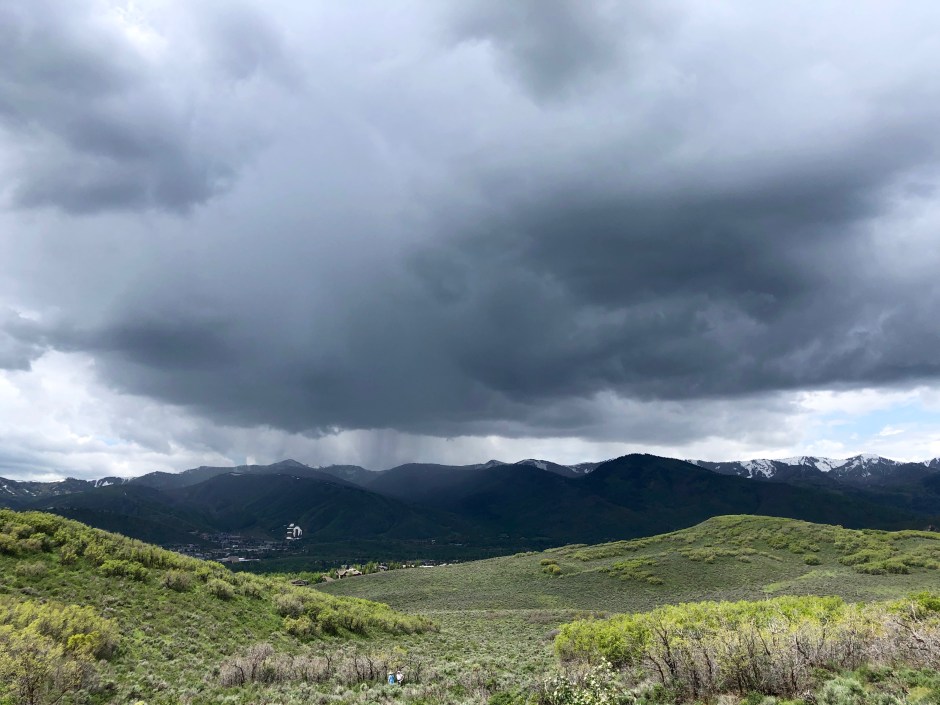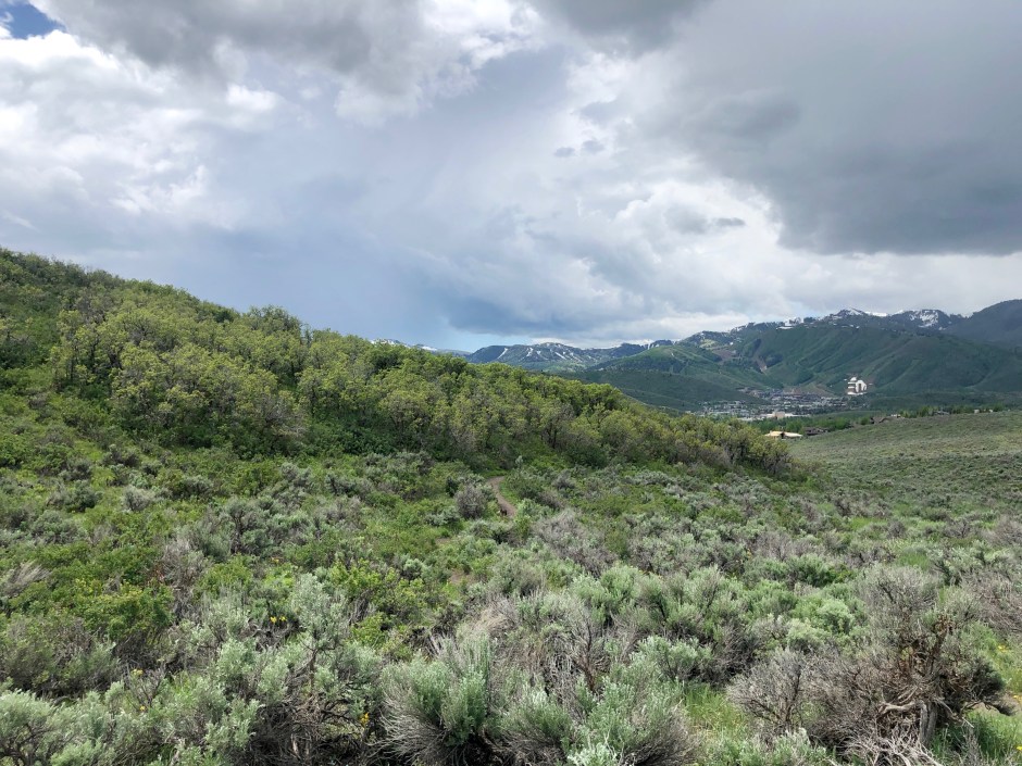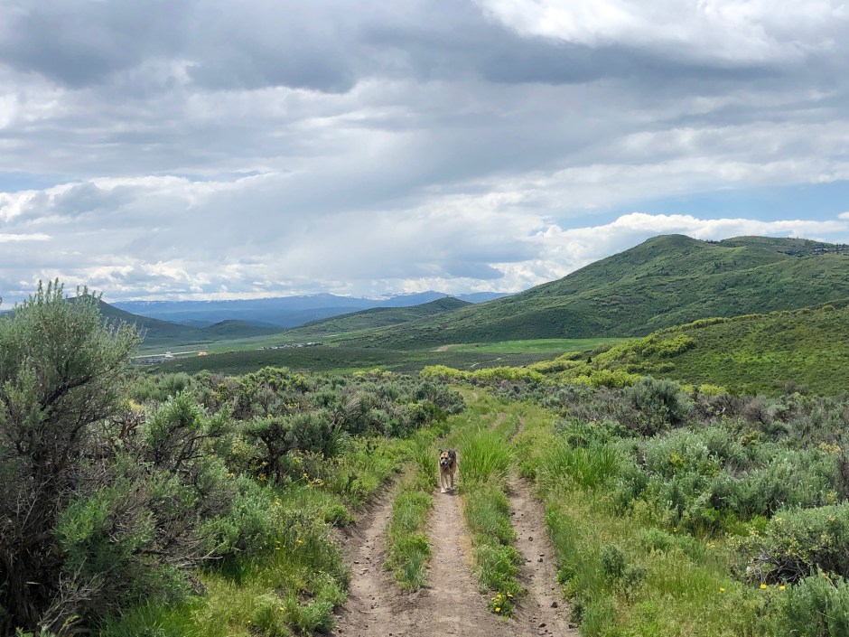 With thunder rumbles growing noticeably louder, I realized suddenly that the dark clouds had moved from over town toward me. Mountain storms come in fast! What happened to all of those singing birds? A few bikers sped past, all heading down toward safety from what now seemed to be an unavoidable summer storm. At first, I thought, “What’s a little rain?” But when a significant lightning flash gave me a start, I hooted another whistle for the dog and did an about-face. A huge clap of thunder herded Cholula down trail faster than I ever could and I vaguely wondered if I was in danger. I scanned my memory for any stories about hikers being struck by lightning in Park City and picked up my pace. I texted John to let him know where I was and followed Cholula’s still-wagging tail back the way we’d come. There’s nothing like an unintentional jog to avoid a lightning strike on an exposed mountain trail to make you feel alive! As we neared the trailhead, I noticed the last car besides my own was pulling away from the parking lot. As she often does, Cholula slowed down when she realized our fun was about to end, sniffing every blade of grass and walking with her head low toward me. I finally lured her with a surprise dog treat that someone had dropped from their car, and she hopped into the Subaru just as the first rain drops hit my windshield.