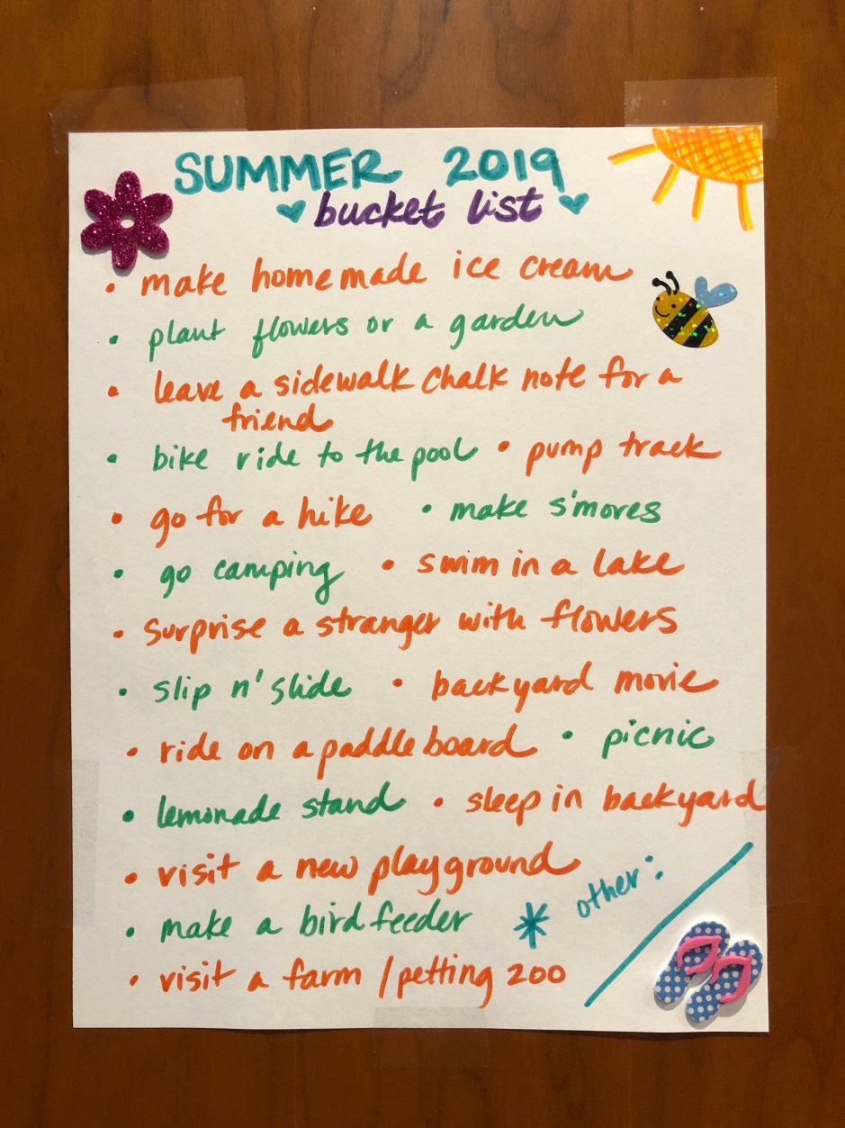 Last year, I put together a fun little Bucket List full of warm-weather activities to do with Oden that would hopefully keep us smiling… and make some memories along the way. Mission accomplished! (You can check out the recap of our adventures here.) This year, I kept a couple of the summer-only items from last year’s list that fall into the MUST DO category: go camping, make ice cream, visit a lemonade stand, stuff like that. I added a few things to encourage kindness, like surprising a stranger with flowers. And I tried to get creative with some new things that I thought Oden might really love. Here’s the list for Summer 2019, taped to the refrigerator and ready to tackle!