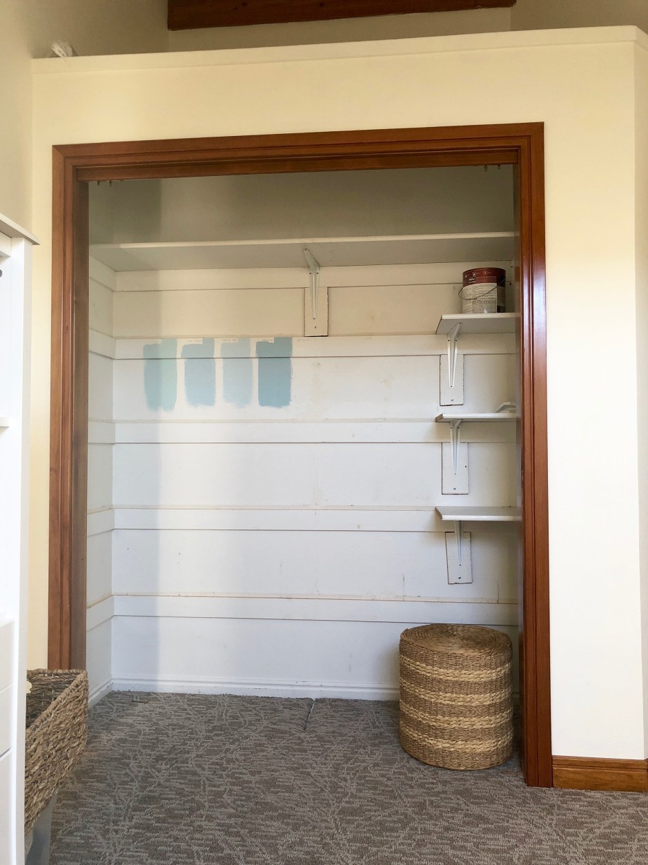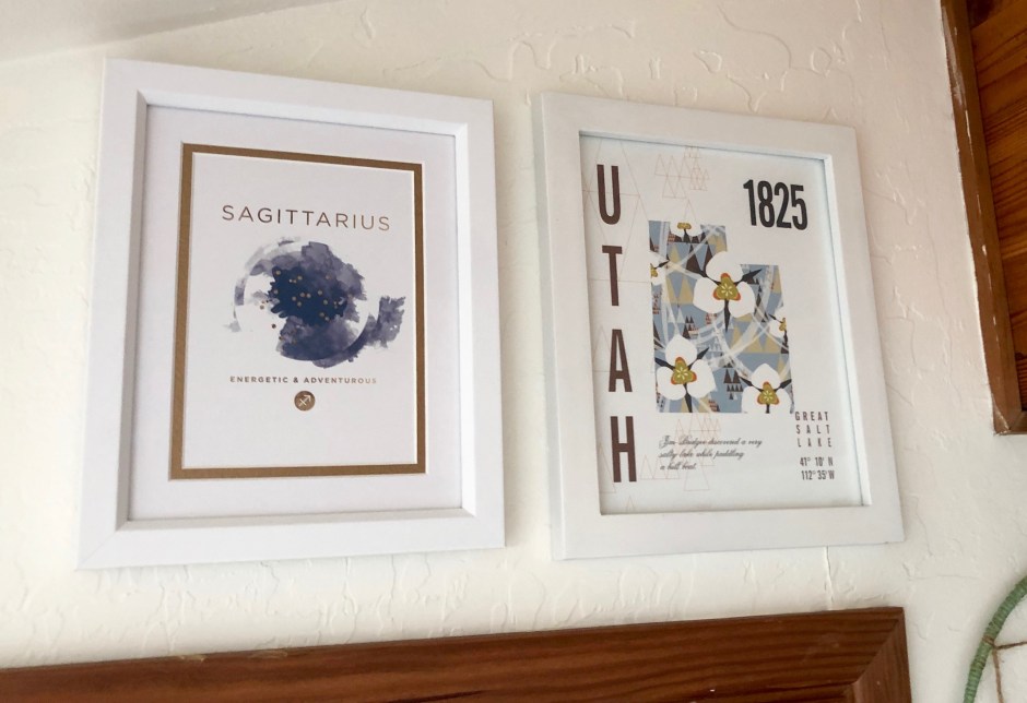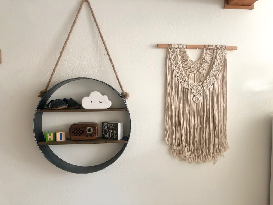 My next idea was to remove the accordion doors and built-in shelves from the closet, paint the inside with a shade of blue, and tuck the changing table in there to maximize space. Sounds simple enough, right? My poor dad battled those closet doors for days! It was almost impossible to figure out how to remove them, despite hours of attempts and multiple Google and YouTube searches. Finally, they were gone and my dad cut back part of the shelving. He made a nook for the changing table but left the shelves in the rest of the closet. John brought home multiple shades of light blue paint from Home Depot and slapped some sample swatches on the wall. In the meantime, I ordered some pretty contact paper for inside the dresser drawers. I also ordered a glider just like Oden’s in a hue that complimented the paint. I had some art framed that I’d picked up on our beach vacation and started tucking beachy, bohemian touches everywhere. I was also drawn to a celestial vibe- sun, moon, stars and clouds.