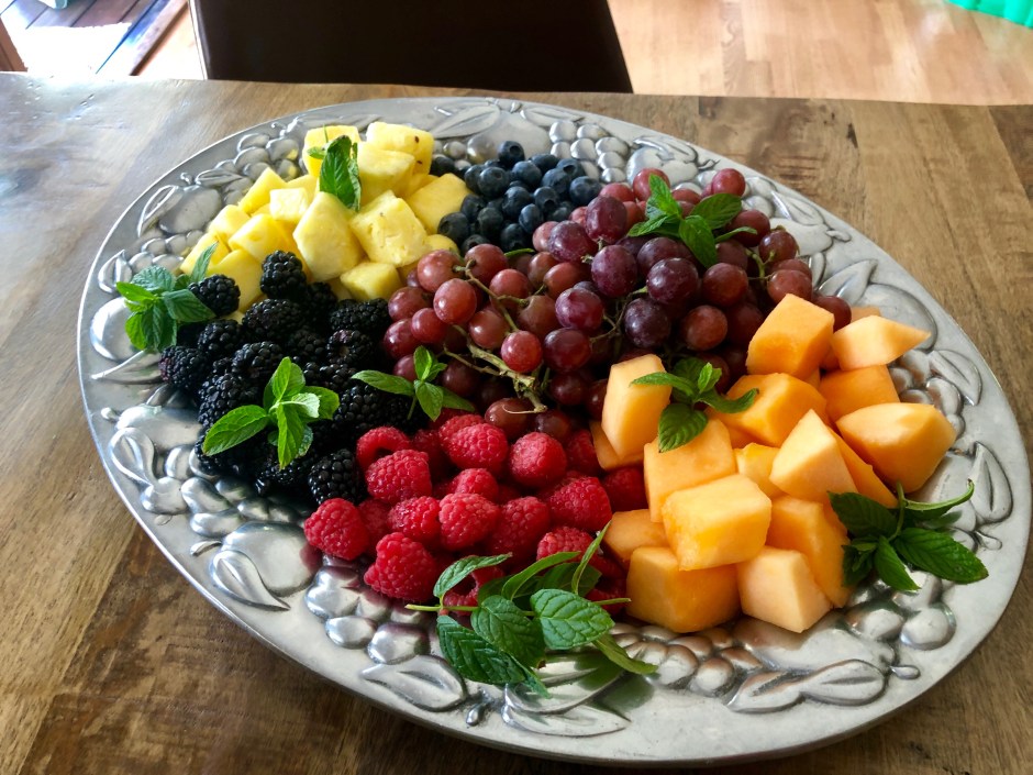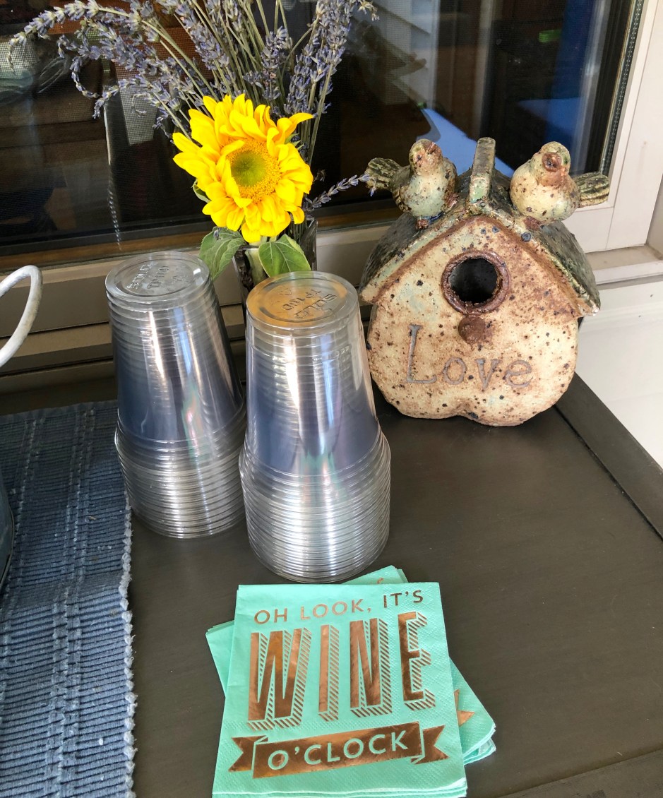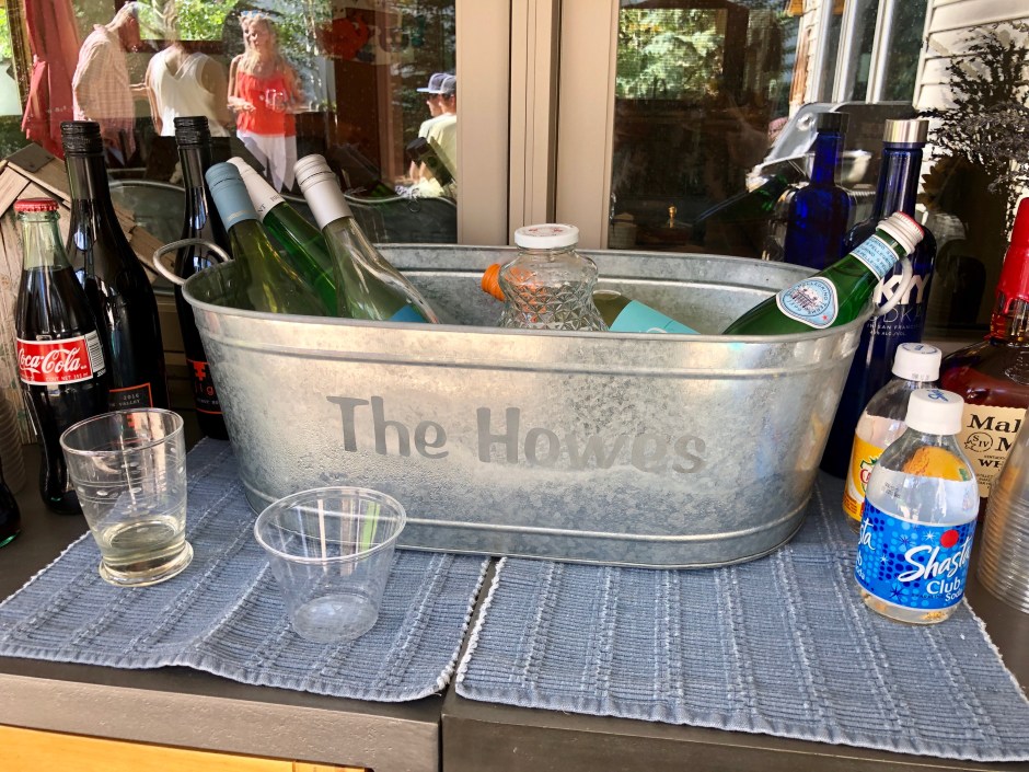 All in all, while most people were out of town, we still had about 13 adults and 5 or 6 kids hanging out on the back deck and yard. John manned the grill and made a batch of his super-yummy BBQ chicken to go with the corn salad. There was cornhole and a bucket of cold drinks, platters of meats and cheeses and fruit (extra mint, courtesy of Oden). Nancy made two delicious hummus dips. Kids were squealing in the cold Jacuzzi, running through sprinklers, and figuring out the old school Slip n’ Slide. My friends played “pass the baby” with Mo, and there was a serious water balloon situation for a while!
