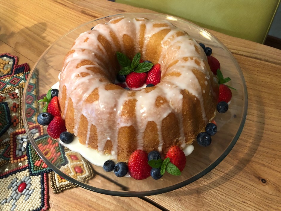 A good time was had by all, and we topped it off with a delicious treat- a 7-Up cake topped with lemon glaze and berries. It’s a recipe from one of John’s mother’s cookbooks. Her name was Isabelle, but her family nickname was I-Belle. He inherited all of her recipes, and it’s so fun to make something he remembers from his childhood! Last 4th of July, he asked me to make this cake and it was a smash hit, so I made it again. This time, everyone wanted the recipe!
